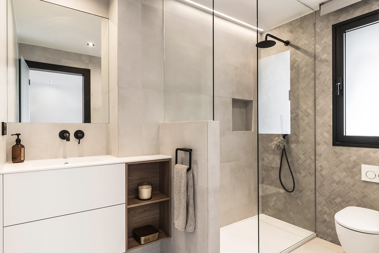 Se recomienda optar por azulejos de gran formato, ya que los azulejos pequeños tienden a generar una cantidad significativa de juntas, lo cual puede crear una sensación de agobio al entrar en el baño. La preferencia por azulejos de mayor tamaño se debe a la capacidad de minimizar estas uniones y lograr una apariencia más limpia y uniforme en las superficies.