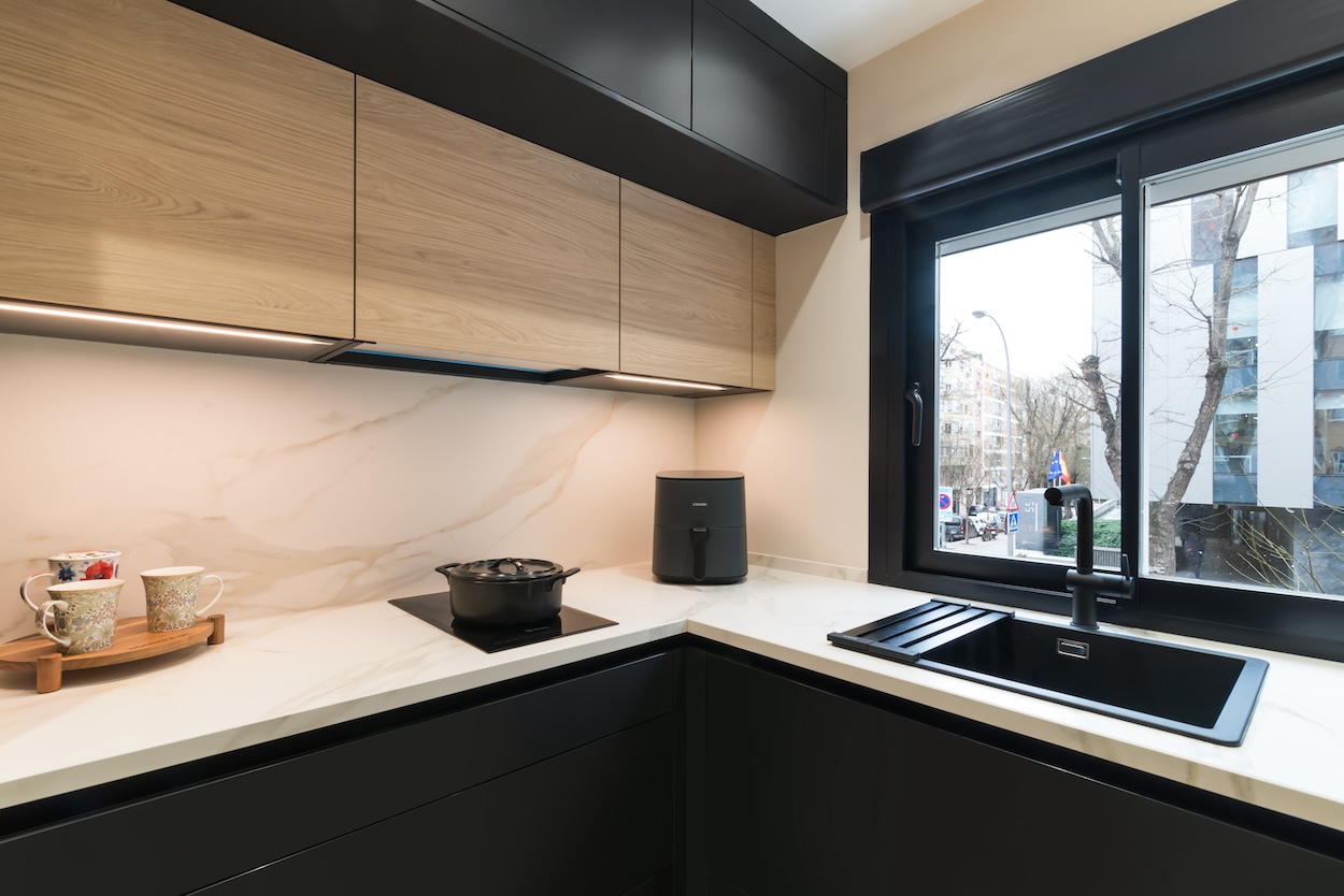 Si se abre en uno de los laterales, se atenúa la sensación de encierro, permitiendo una conexión más fluida con otras estancias de la casa, como el salón o el comedor. Al eliminar las barreras visuales, este diseño crea una transición suave entre los diferentes espacios, lo que favorece la circulación del aire y la luz, haciendo que la cocina se sienta más amplia y abierta.