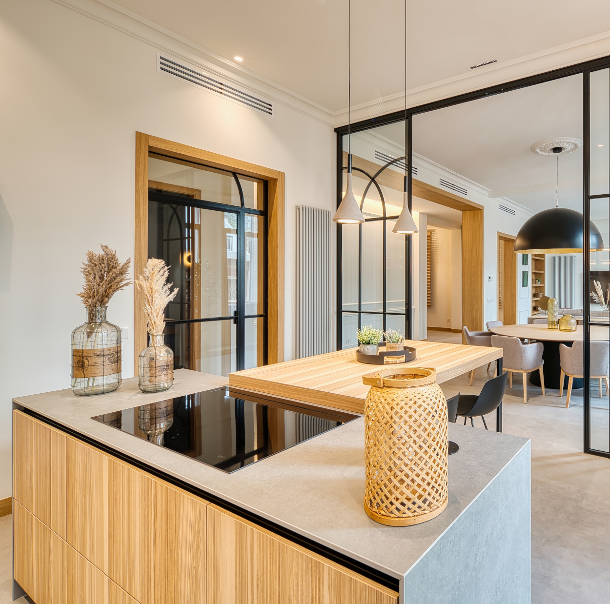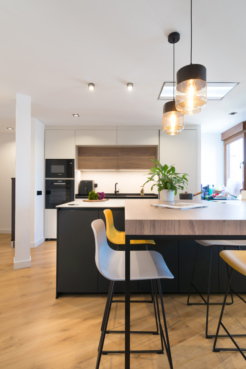 El tamaño no debe ser un problema para tener una cocina moderna, cómoda y con estilo. Opta por una cocina abierta al salón para evitar la división con paredes y crear un ambiente más amplio y luminoso. Al eliminar obstáculos visuales, no solo ganarás en sensación de espacio, sino que también conseguirás una distribución más fluida y práctica para el día a día.