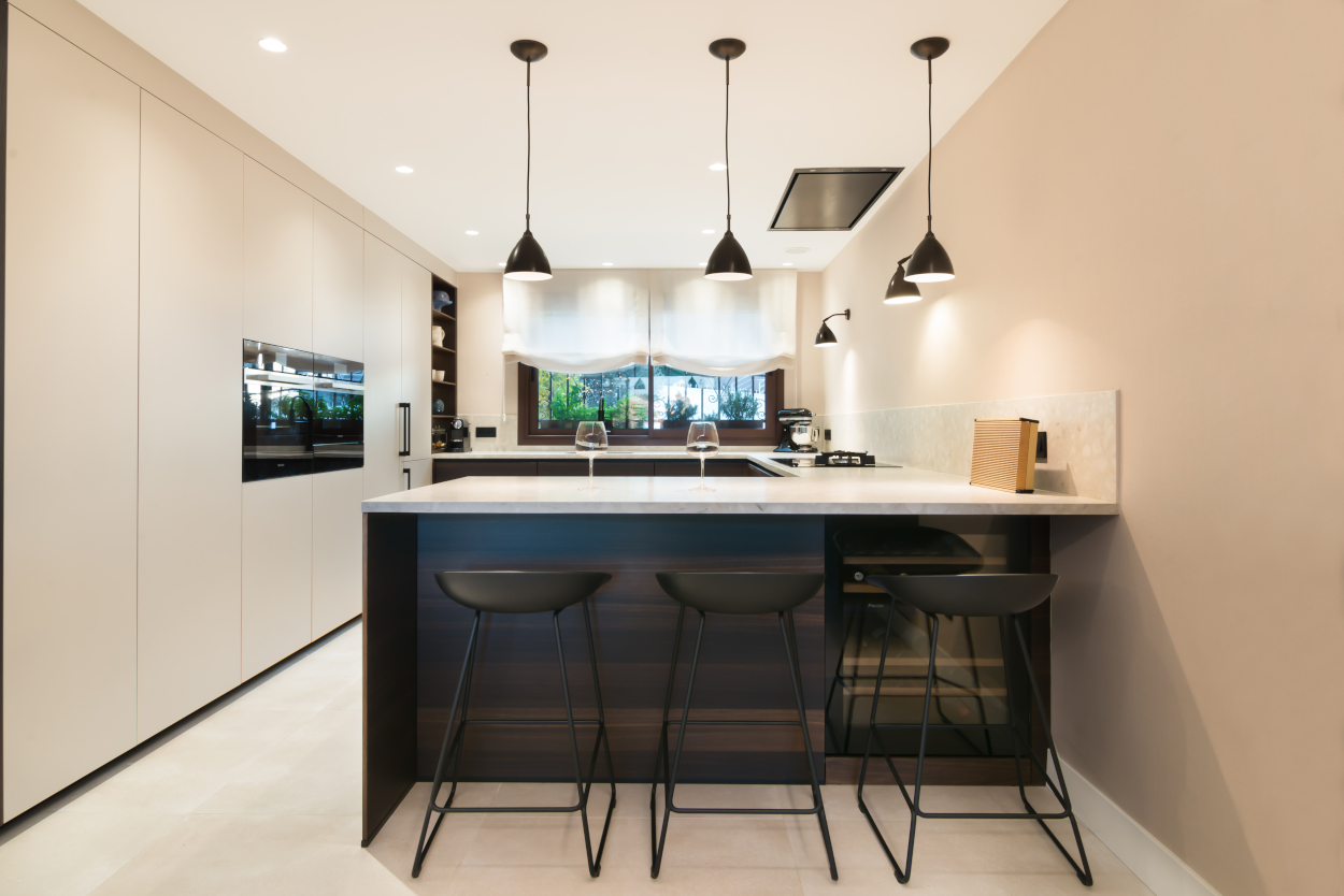 Además, no renuncies al equipamiento moderno, en una cocina pequeña puede ser tan funcional como una grande si aprovechas bien cada centímetro. Los muebles de gran almacenamiento que llegan hasta el techo, permiten guardar todo lo necesario sin saturar el ambiente. Los electrodomésticos compactos e integrados, como hornos multifunción o placas de inducción con campanas incorporadas, ayudan a mantener la estética limpia y ordenada.