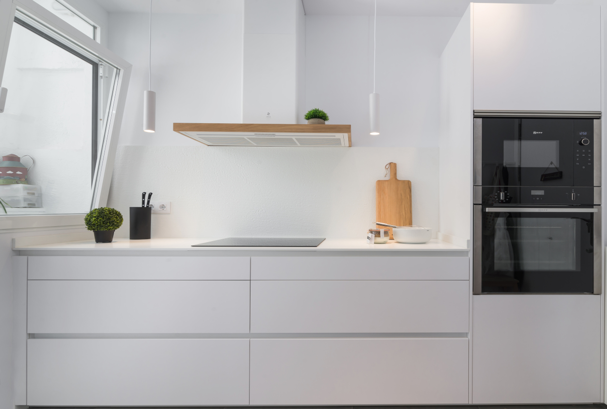 Muebles blancos, el color blanco es una de las bases para conseguir este estilo. El blanco genera sensación de amplitud y proyecta la luz hacia el interior convirtiendo la cocina en un lugar más luminoso.