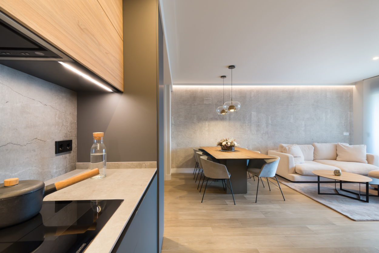 Cocina moderna de Santos abierta al salón comedor, la integración visual ha sido clave para ganar sensación de amplitud y continuidad entre ambas estancias.