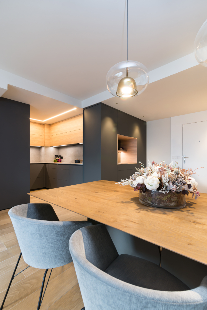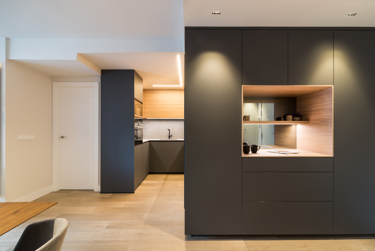 El diseño combina mobiliario en tonos grises suaves con acabados en madera natural, creando un ambiente cálido, actual y equilibrado. Esta mezcla de materiales no solo aporta estética, sino también sensación de orden y limpieza visual. Hacia el comedor, un conjunto de módulos a medida actúa como punto de transición: incluye una zona de desayunos práctica y acogedora, además de una solución de almacenaje generosa que ayuda a mantener todo en su sitio.