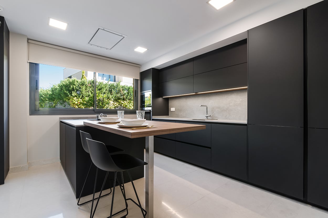 Si deseas suavizar un poco el impacto del negro, puedes incorporar elementos en blanco o madera clara. Estos aportarán un contraste equilibrado y agregarán calidez al espacio, manteniendo al mismo tiempo la sofisticación y la elegancia de la cocina negra moderna.