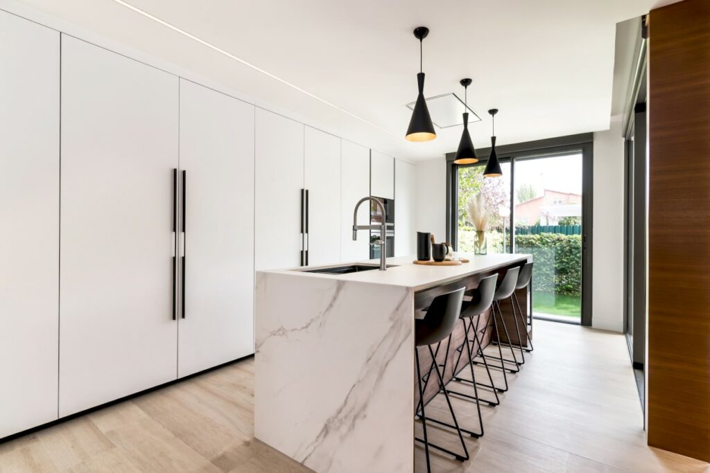 Otra opción es combinar el blanco con el negro, lo que resulta en una estética elegante y atemporal. Esta combinación crea un contraste llamativo y sofisticado que realza el diseño de la cocina.