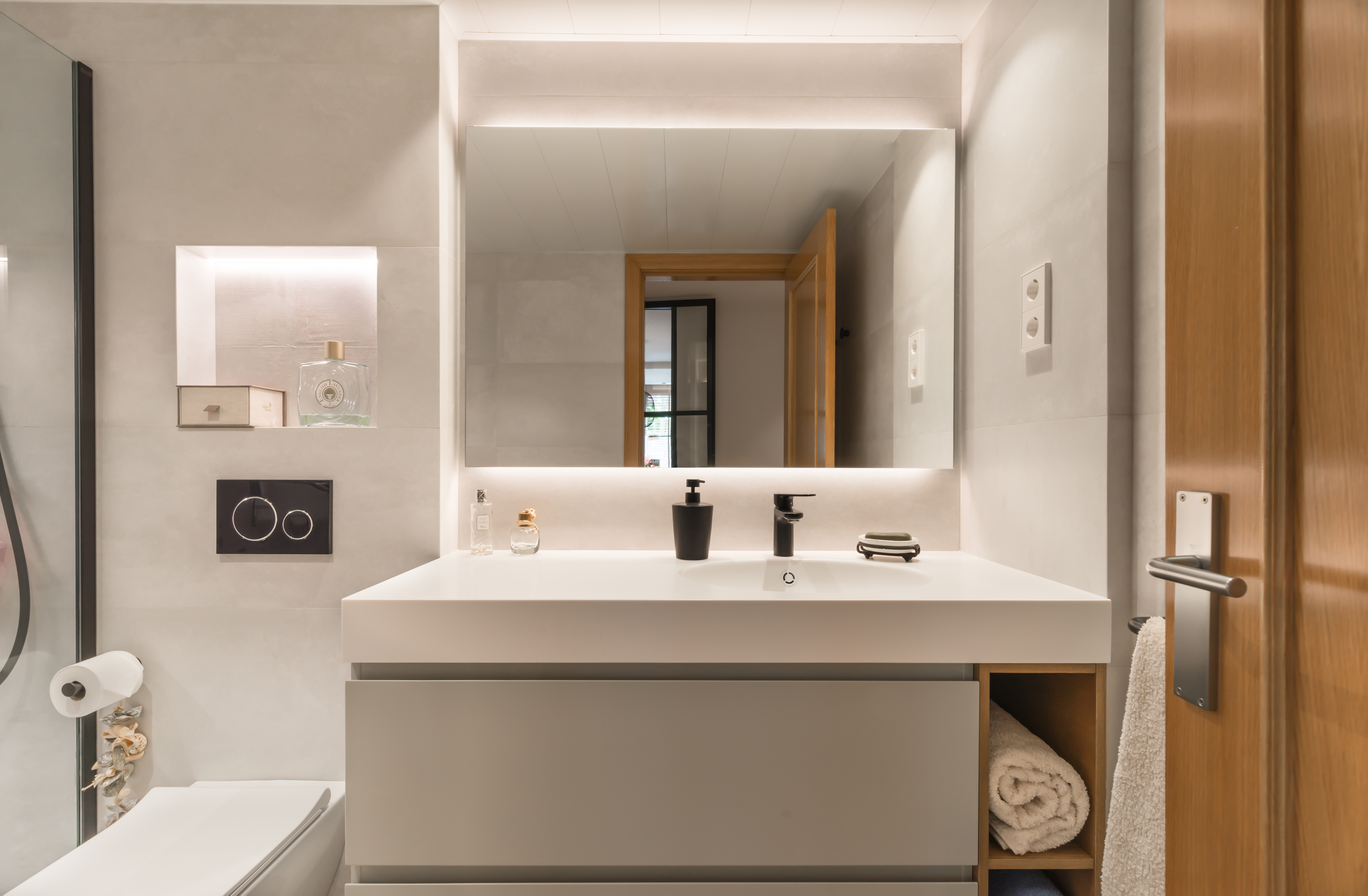 La luz es clave en cualquier espacio. Coloca luces cálidas en los espejos para un efecto acogedor, y añade focos empotrados o lámparas colgantes para complementar la decoración.