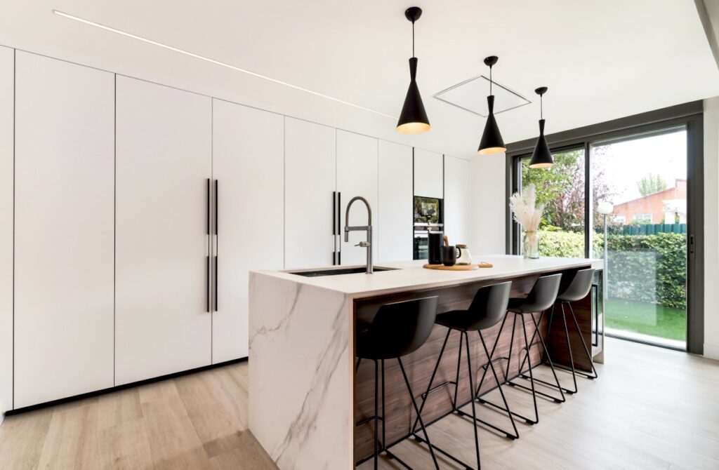 Una de las características más distintivas de las cocinas de diseño es su enfoque minimalista. Los tiradores desaparecen, creando superficies lisas y continuas que aportan una sensación de orden y limpieza. Este diseño sin tiradores no solo mejora la apariencia estética, sino que también facilita la limpieza y el mantenimiento.
