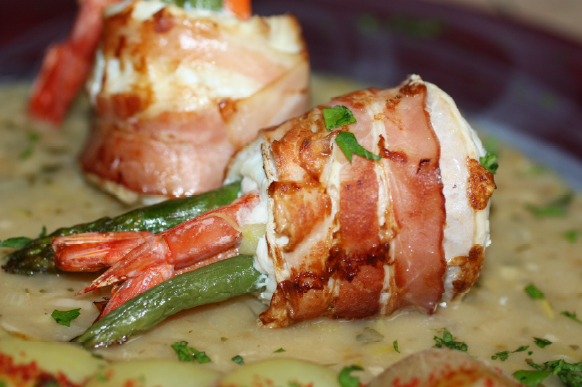 c) Salpimentar los filetes de lenguado por ambos lados, poner en un extremo una punta de espárrago, la zanahoria, la judía y la gamba y enrollar. Envolver con la panceta y atar con un poco de hilo de cocina.