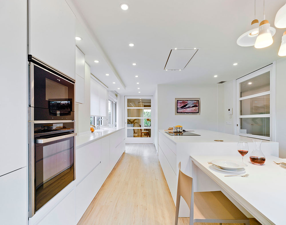 - Estilo minimalista. Este estilo es el rey por antonomasia del “menos es más”, por lo que debe ser un espacio diáfano, sin abigarramientos de ningún tipo y con líneas muy simples. Esa sobriedad de la que se caracteriza el minimalismo hace que las cocinas se vean muy elegantes y lujosas a la par que simples y cómodas, pues el almacenamiento y la practicidad priman en todos los sentidos. Pero ojo, que no se trata de hacer de la cocina un entorno desangelado, sino de dar con las líneas, las formas, los tonos y las texturas adecuadas para encontrar el nivel de armonía visual idóneo. Las líneas rectas y bien definidas, los muebles lacados, los electrodomésticos encastrados y de acero inoxidable y una iluminación fría pondrán la base para la consecución de cocina blanca minimalista impecable.