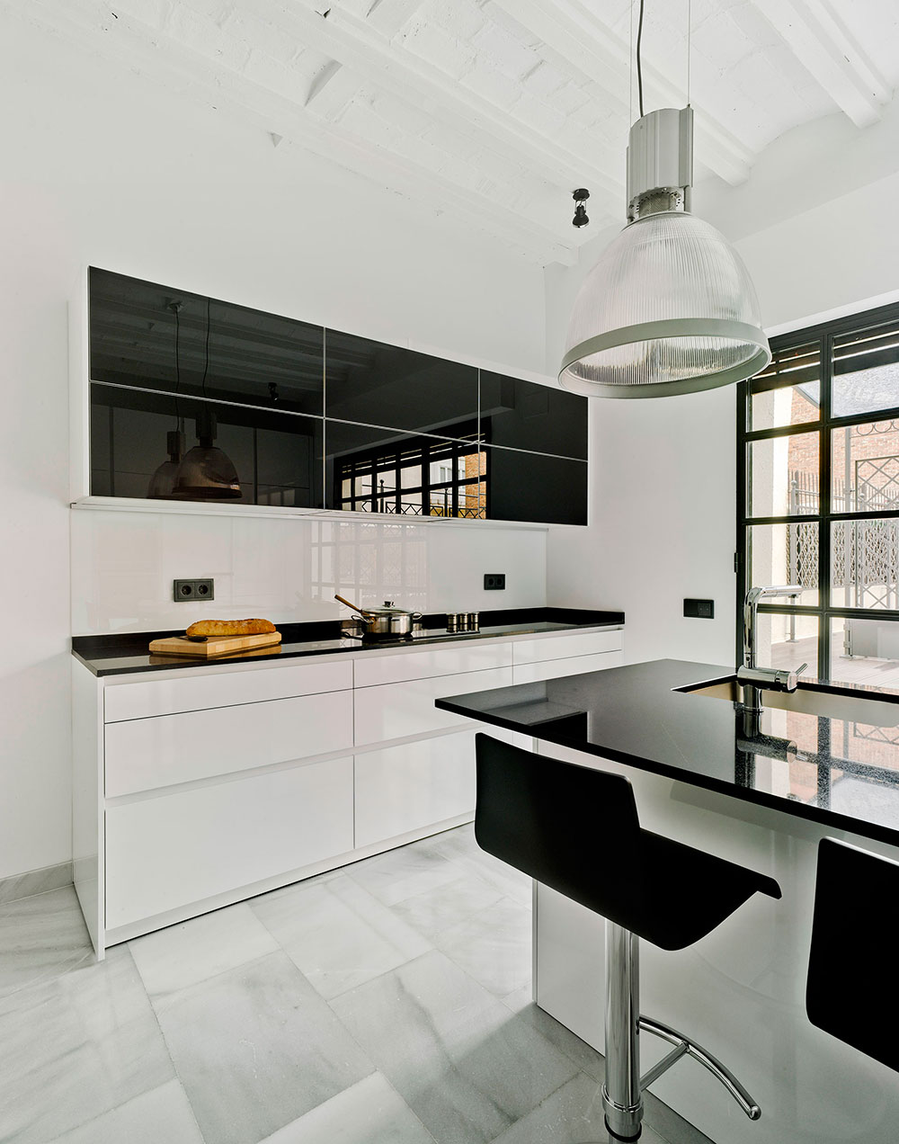 - Estilo industrial. El estilo industrial es uno de los que más fuerte apuesta por los contrastes en las cocinas blancas. Puedes probar a romper el mono cromatismo con una pared aislada de pizarra, o con una isla (si el espacio lo permite) que sea negra con la encimera marmolada o de cuarzo blanco, justo al contrario que el resto de muebles o que la tónica general de la cocina. Elige armarios lisos sin tiradores y panelados, que aportan un aire muy sofisticado y limpio, y agrega elementos de hierro o metal al resto de la cocina: algún carrito con ruedas, en los marcos de las ventanas, colgadores de pared o techo para utensilios…los suelos de hormigón también pueden ser una baza interesante para una cocina blanca moderna de estilo industrial.