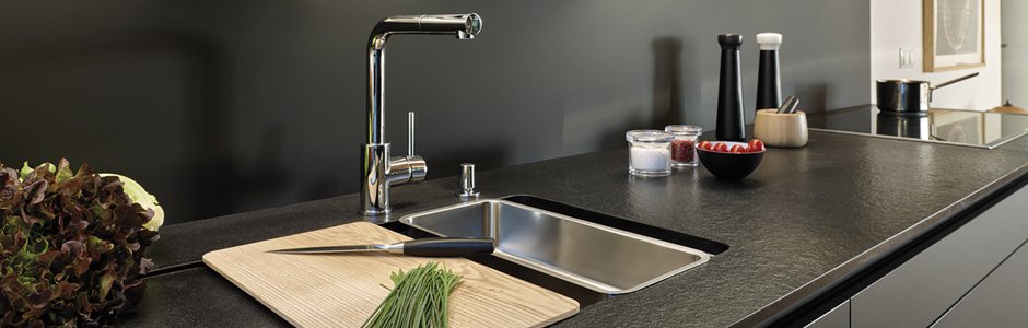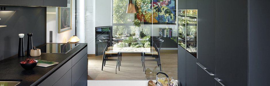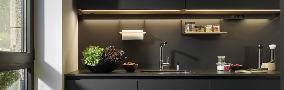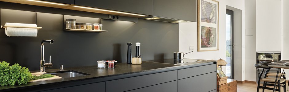 Además de su aplicación a los frentes de los muebles de cocina, podemos realizar la composición completa de nuestra cocina. Dentro del catálogo de los muebles de Santos, dispones de encimeras y traseras del mismo material anti-huella, así como perfiles de iluminación también recubiertos en este material, creando así un espacio uniforme, monocromático y muy elegante a la vista y al tacto.