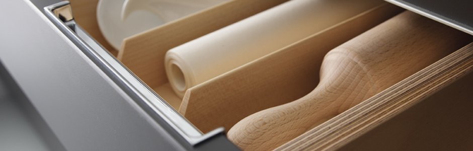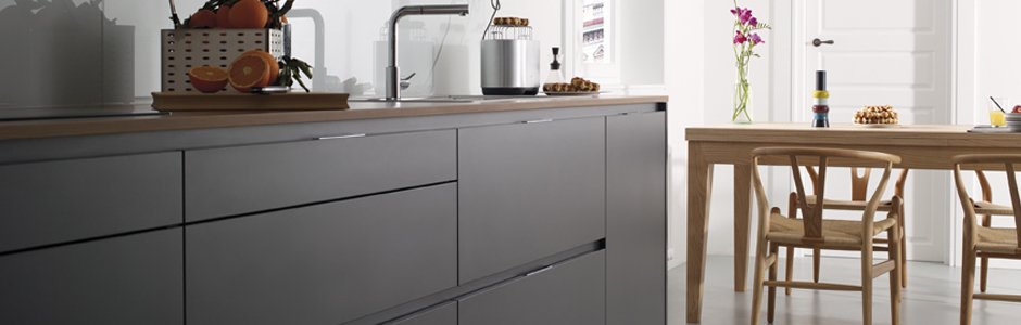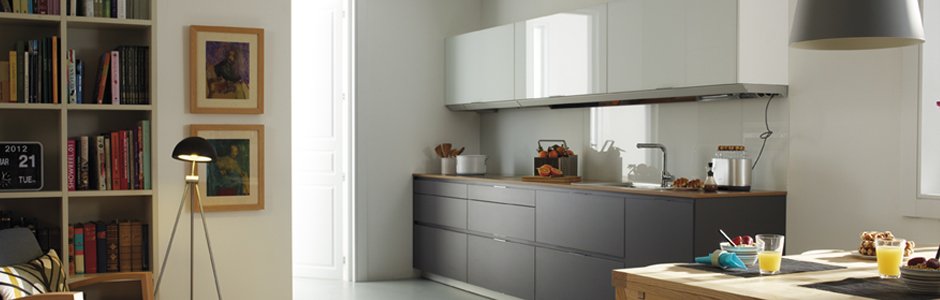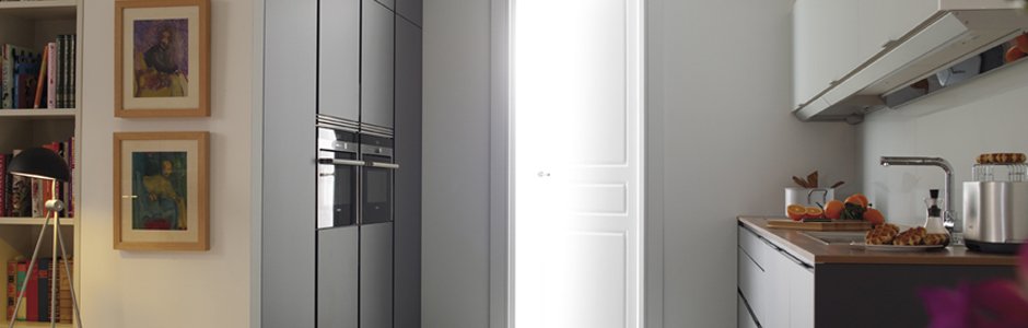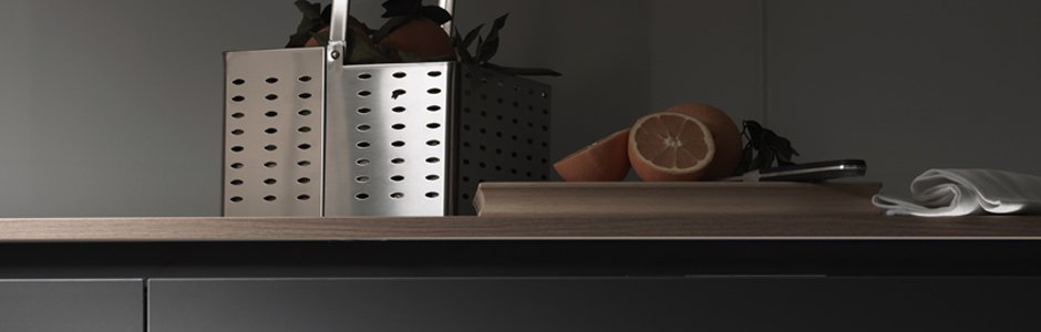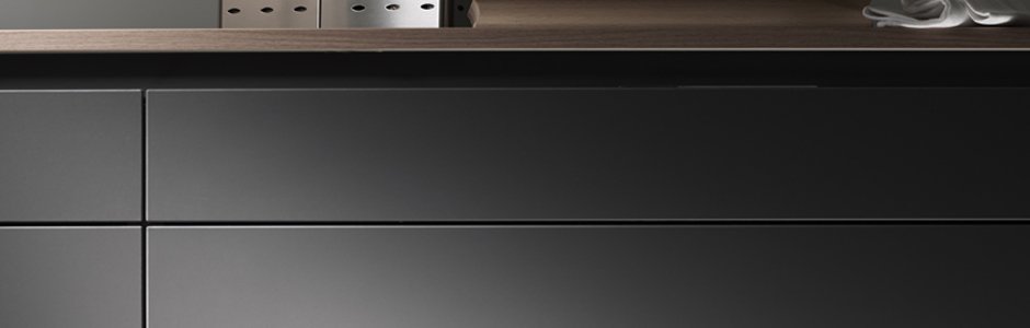 El sistema de apertura del modelo Umbra se caracteriza por la discreción. Su secreto: el tirador se combina con una gola de igual color que el frente de la cocina, integrándose perfectamente en el conjunto.