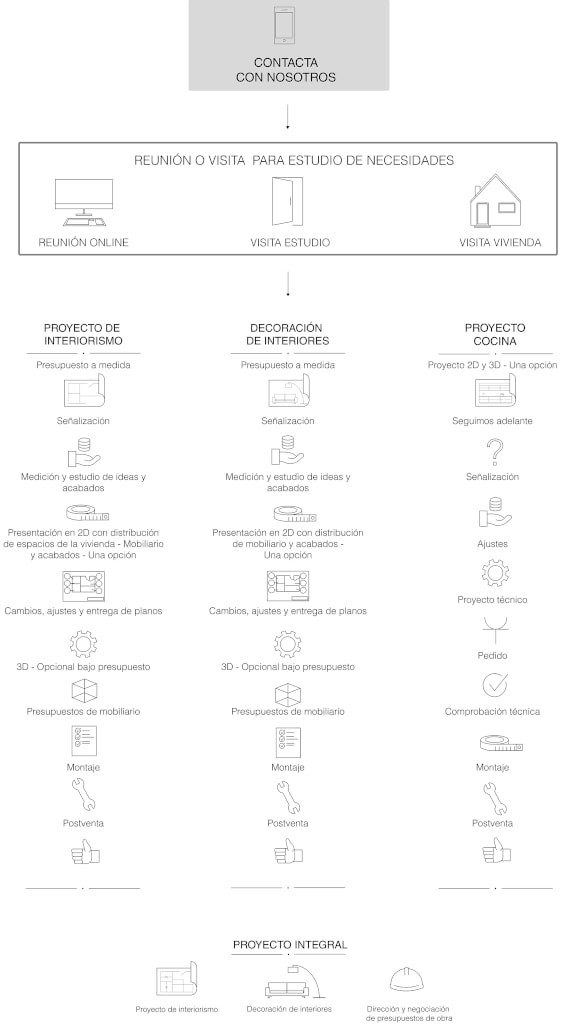Para llevar a cabo un proyecto de interiorismo, en nuestros estudios seguimos un proceso estructurado que garantiza un resultado óptimo: