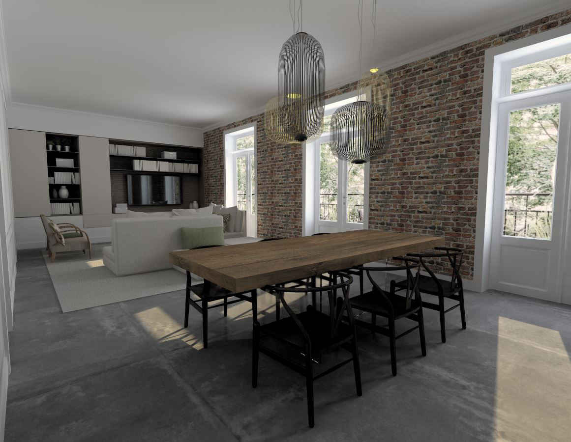 Infografia de proyecto de interiorismo en 3D para salón y resultado final