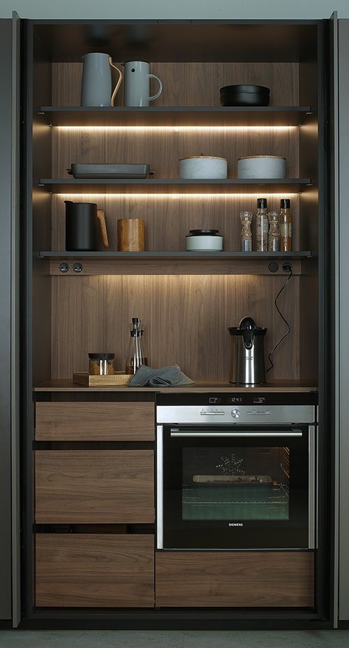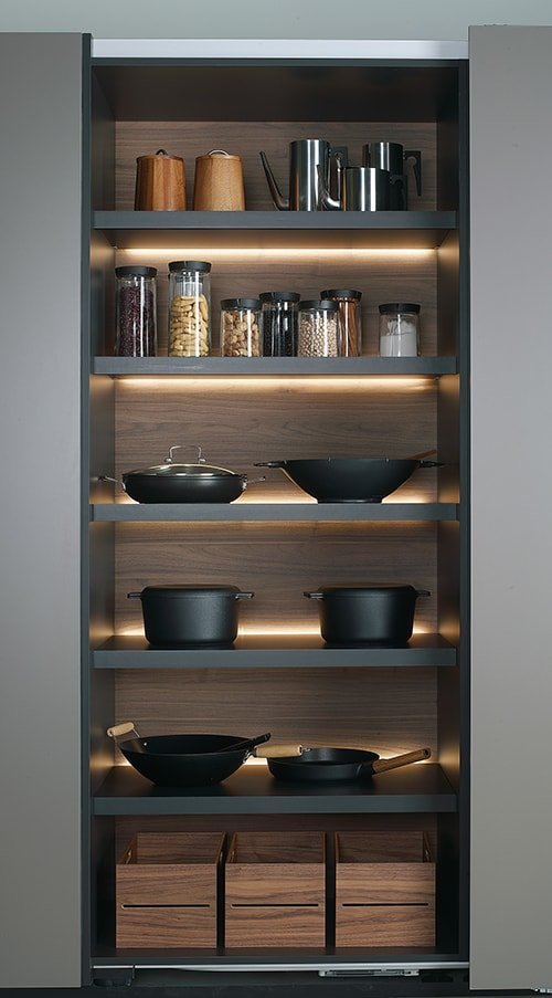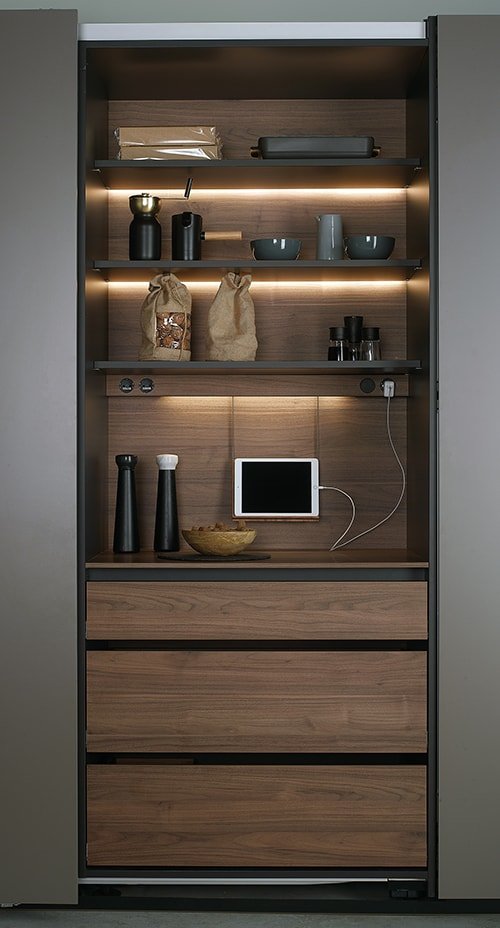 Las columnas al igual que los demás muebles de cocina se pueden personalizar con diferentes accesorios como tomas de corriente, perfiles de iluminación, estantes o cajones contenedores.