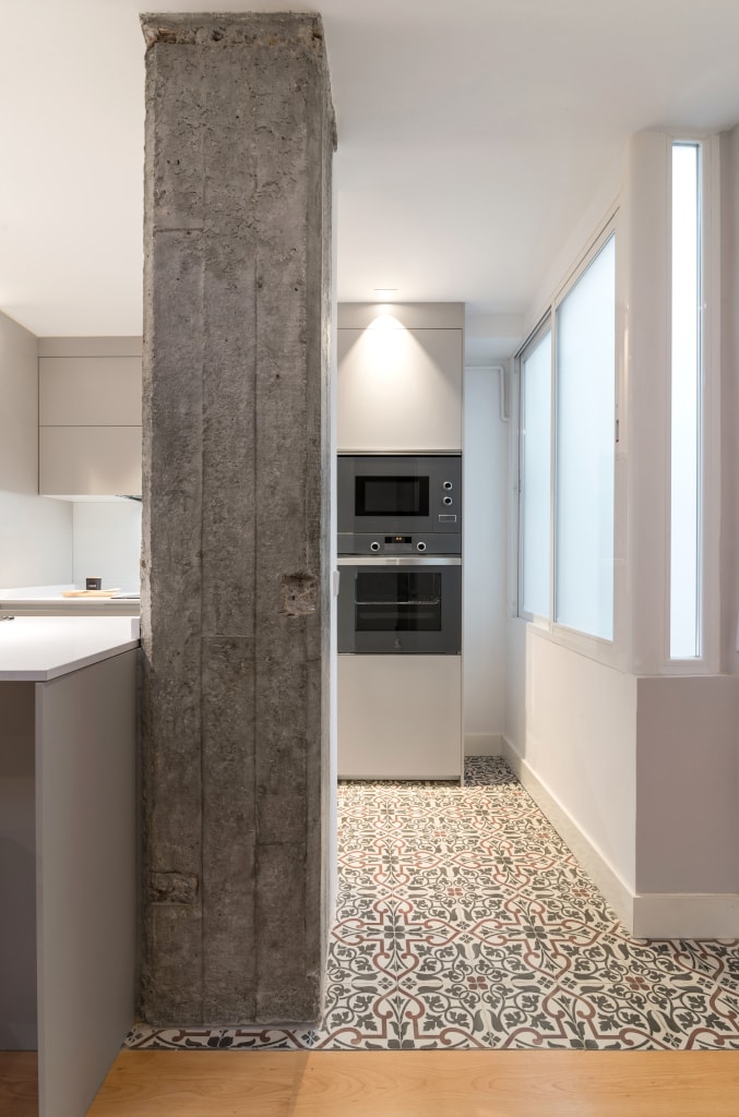 Cemento, suelo porcelánico y colores neutros. La armonía de esta cocina se consigue gracias a la mezcla de varios materiales como el suelo tipo mosaico, la columna de obra en cemento y el delicado material de los muebles Santos. La encimera volada cobra protagonismo en esta cocina, creando una barra para tres comensales.