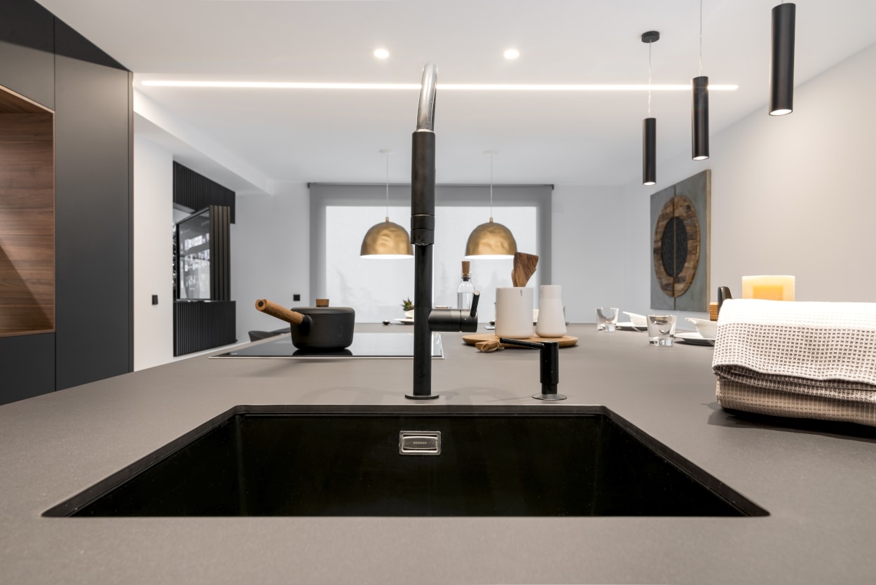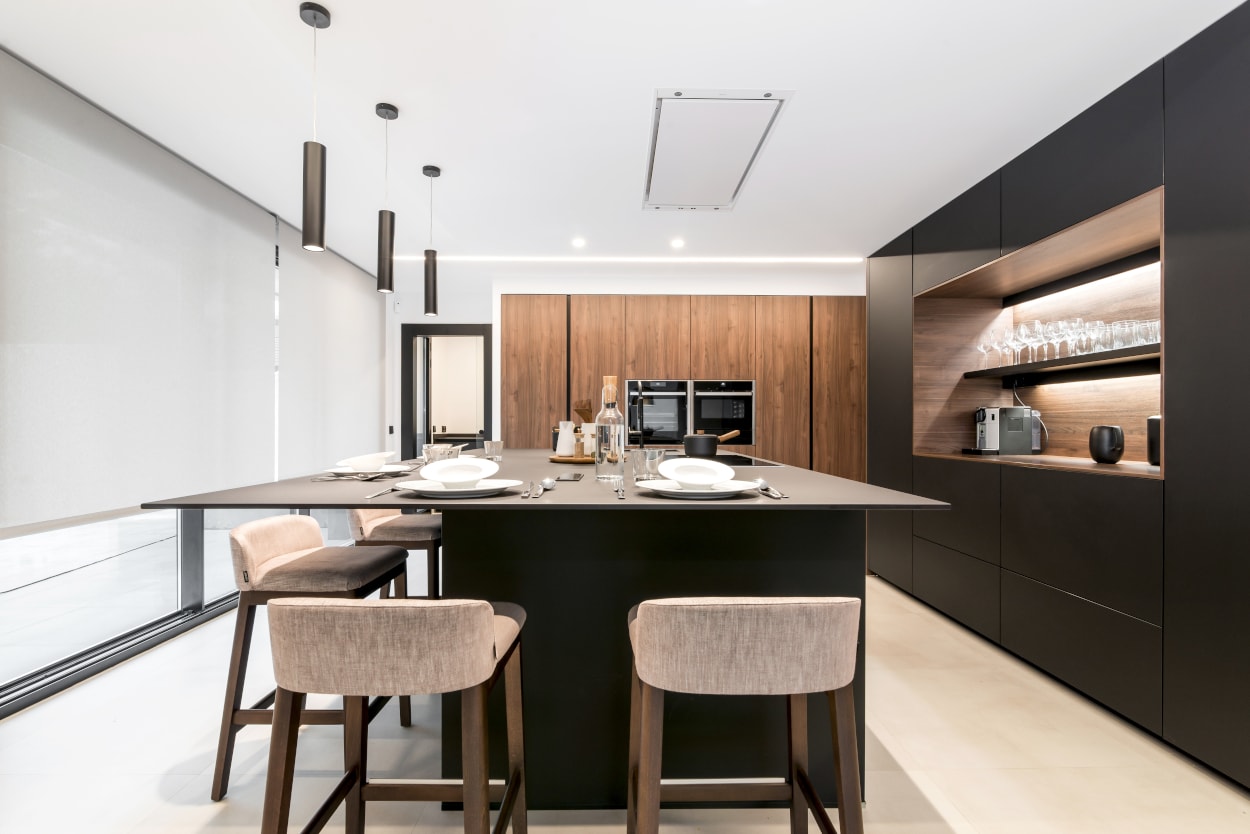 El negro siempre ha sido una seña de elegancia y sofisticación. Esta cocina con isla destaca por su total black. Una gran isla como protagonista de la estancia hace que sea el corazón de la vivienda y el punto de reunión. Esta cocina además de ser moderna y de lujo, destaca por su comodidad y gran capacidad de almacenaje, haciendo la vida más sencilla a sus usuarios.