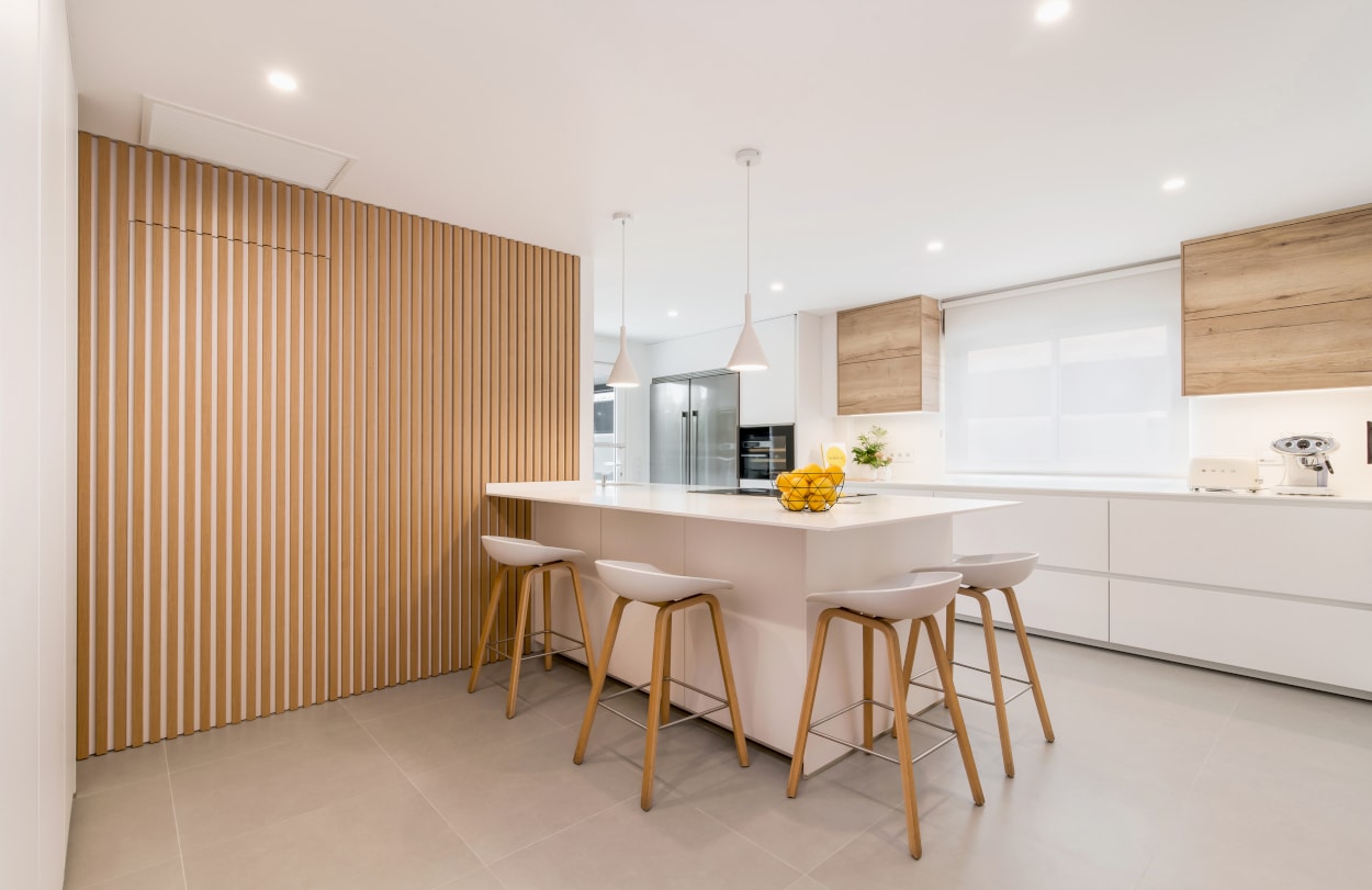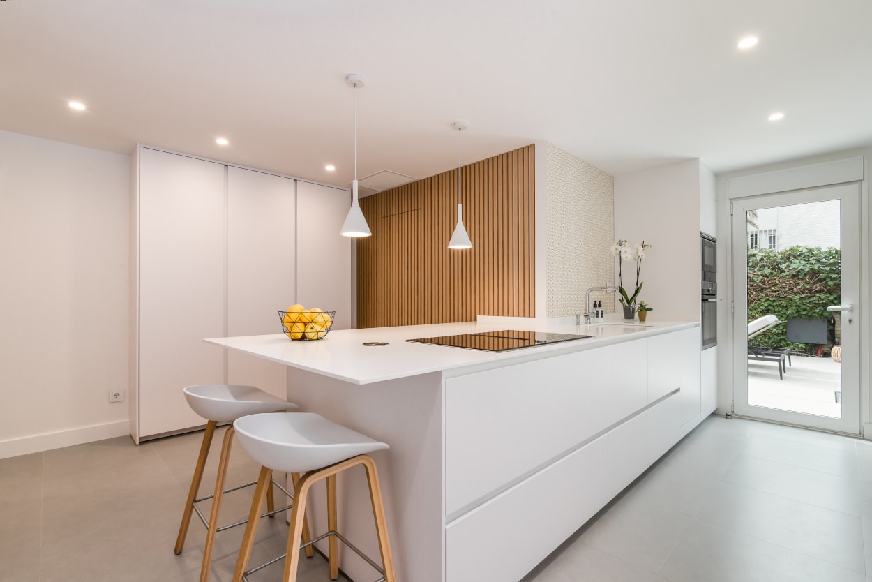 El blanco aporta luminosidad y la madera sofisticación. La combinación de colores de esta cocina encaja a la perfección para obtener una cocina atemporal y elegante. El color blanco crea espacios amplios, luminosos y acogedores, en cambio, la madera le da el toque cálido, sofisticado y de lujo.