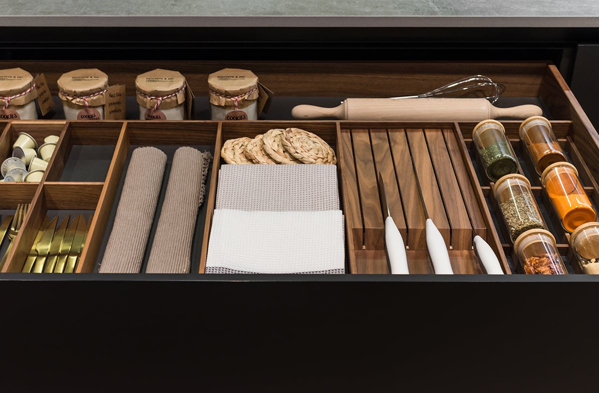 Los cajones de cocinas Santos son de gran capacidad y están equipados con accesorios extraíbles e intercambiables, facilitando así la organización y localización de contenidos en el día a día.