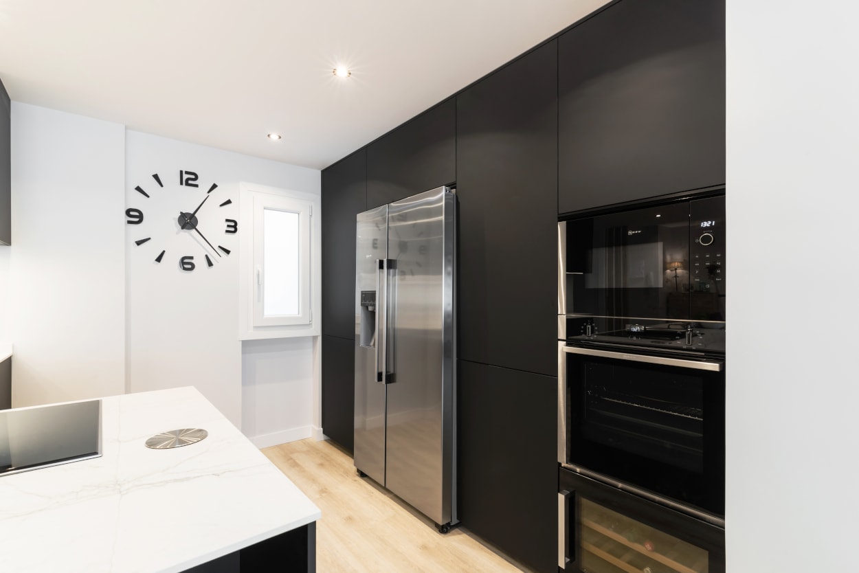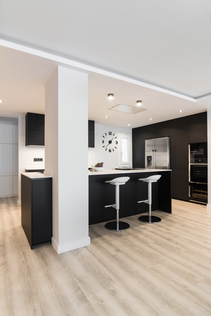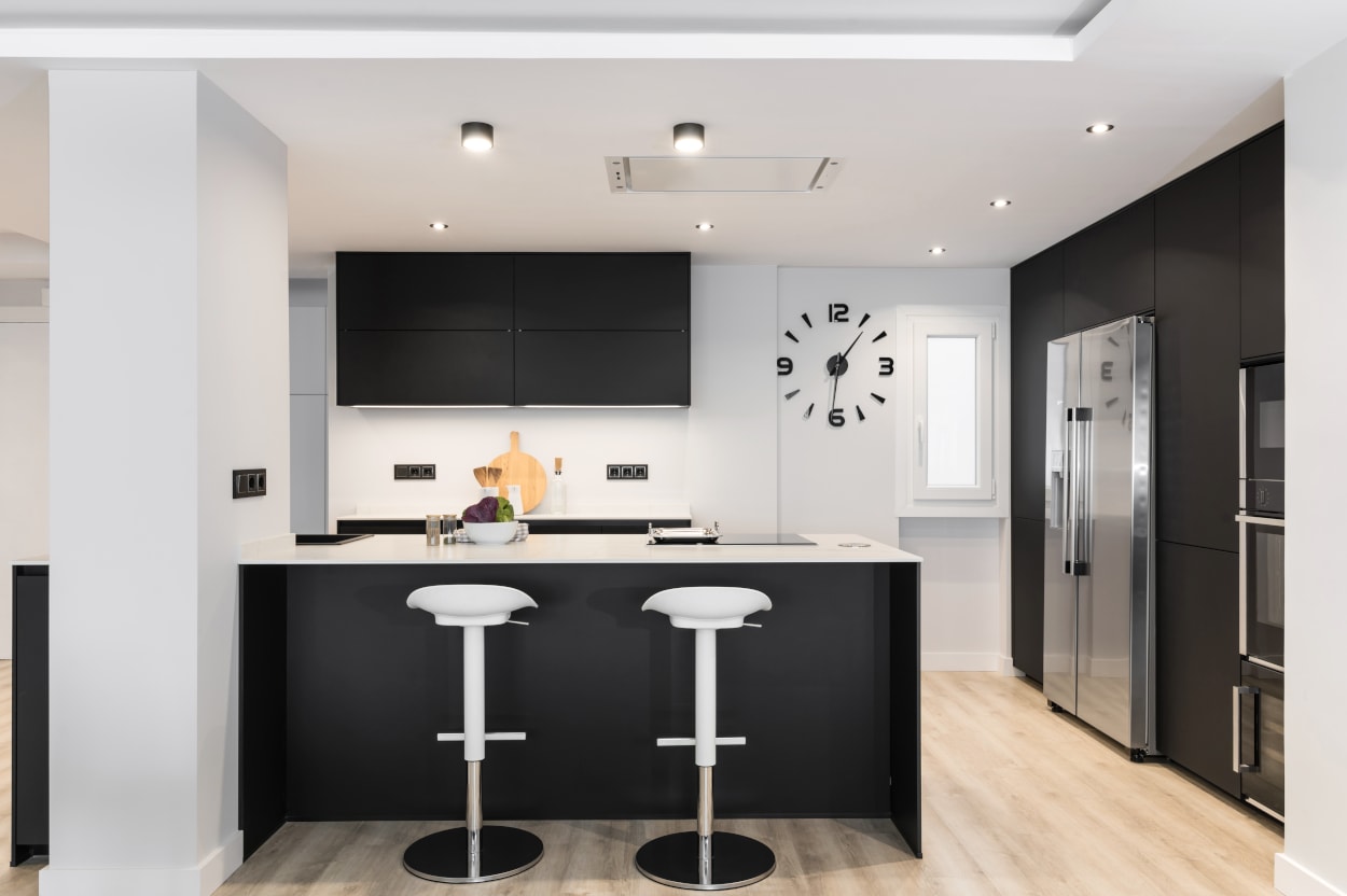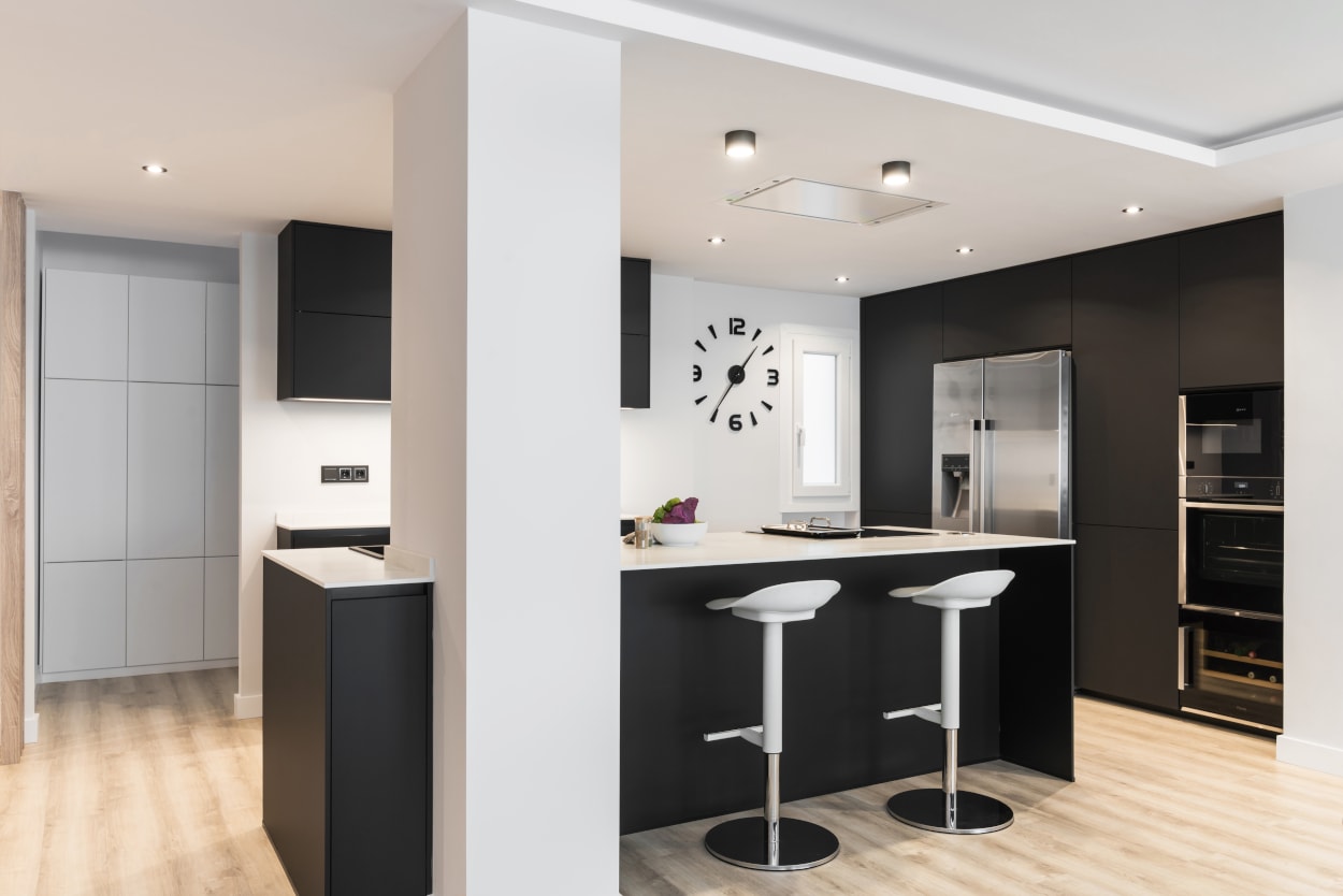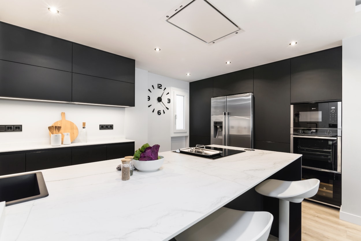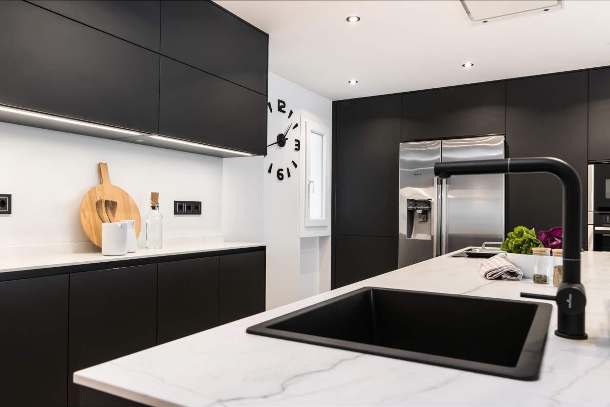 El color negro de los muebles combinado con el blanco de la encimera, convierte esta cocina en un diseño moderno, elegante y luminoso.