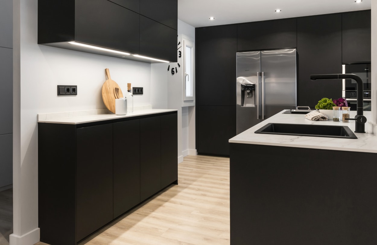 El resultado del cambio de imagen fue una cocina moderna, en color negro seda de Santos, con encimera de Neolith color Mont Blanc.