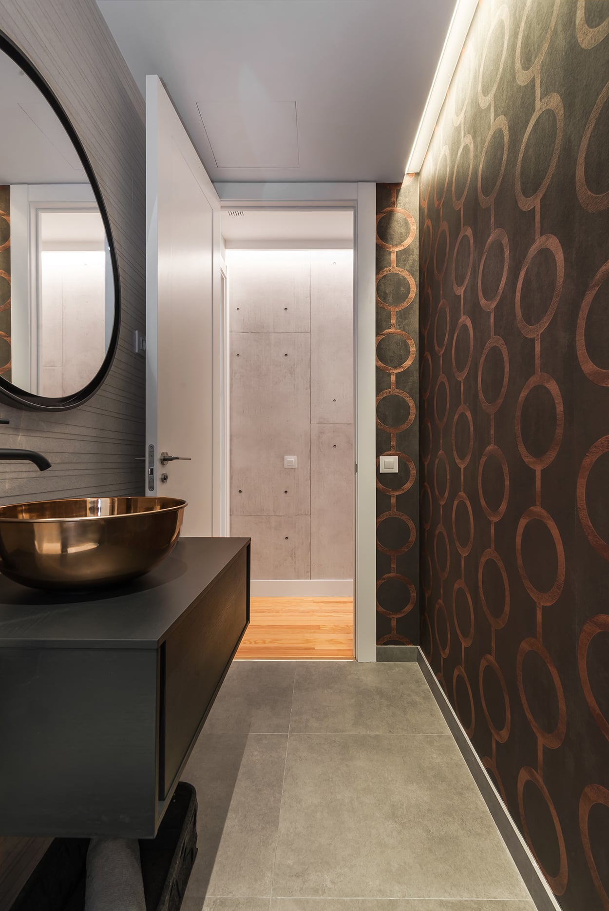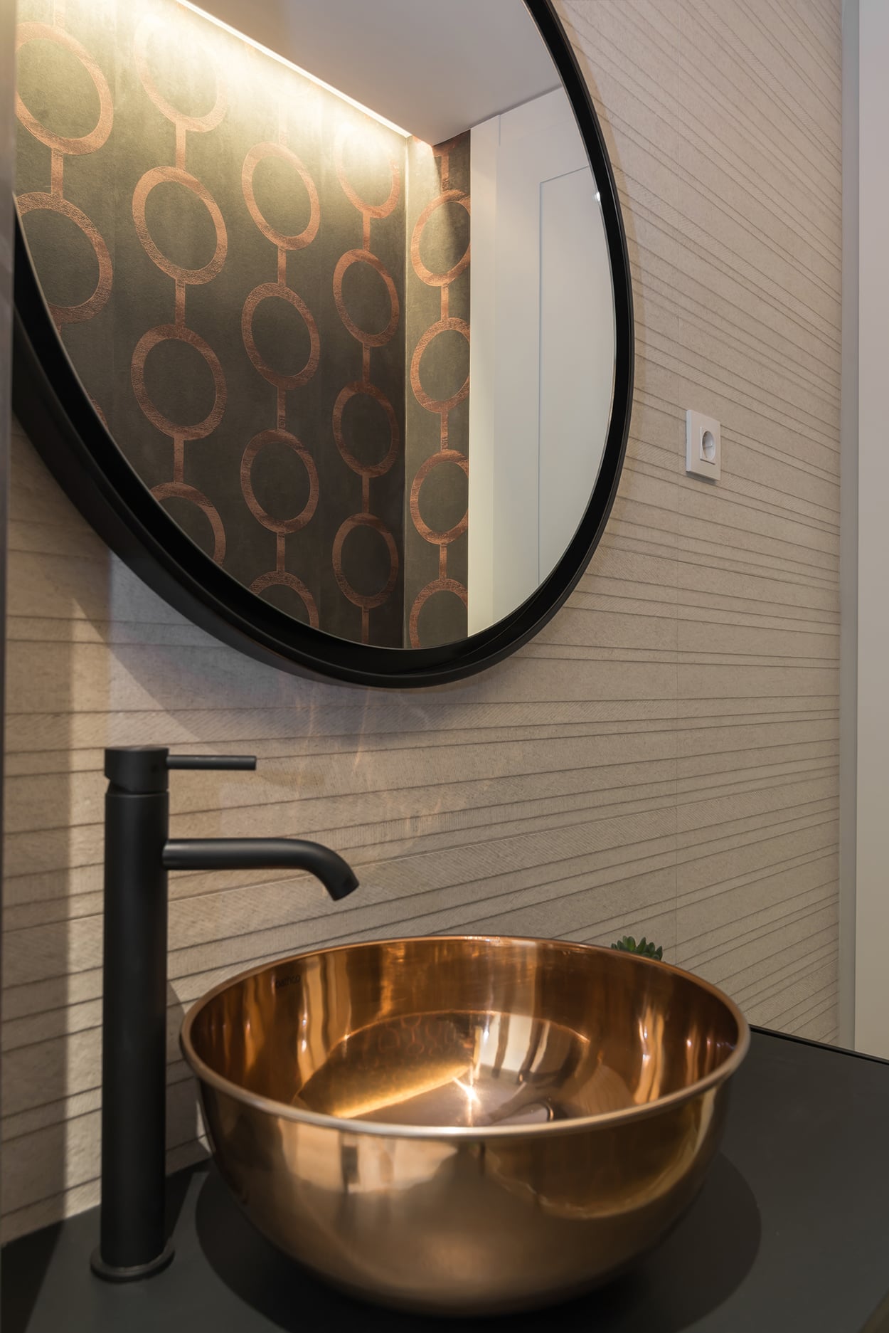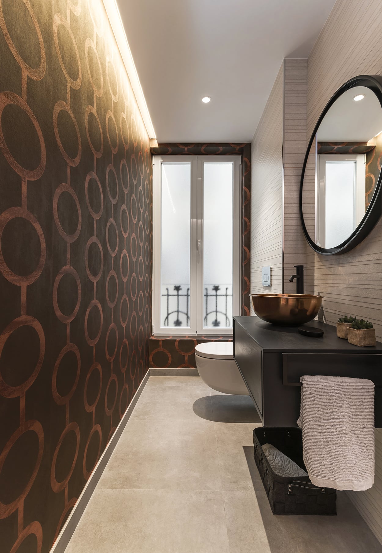 El papel pintado arrasa en los baños o aseos modernos, por ello, decidimos colocar un papel pintado de la marca Glamora, en tonos marrones y ocres, haciendo juego con el lavabo de bronce.