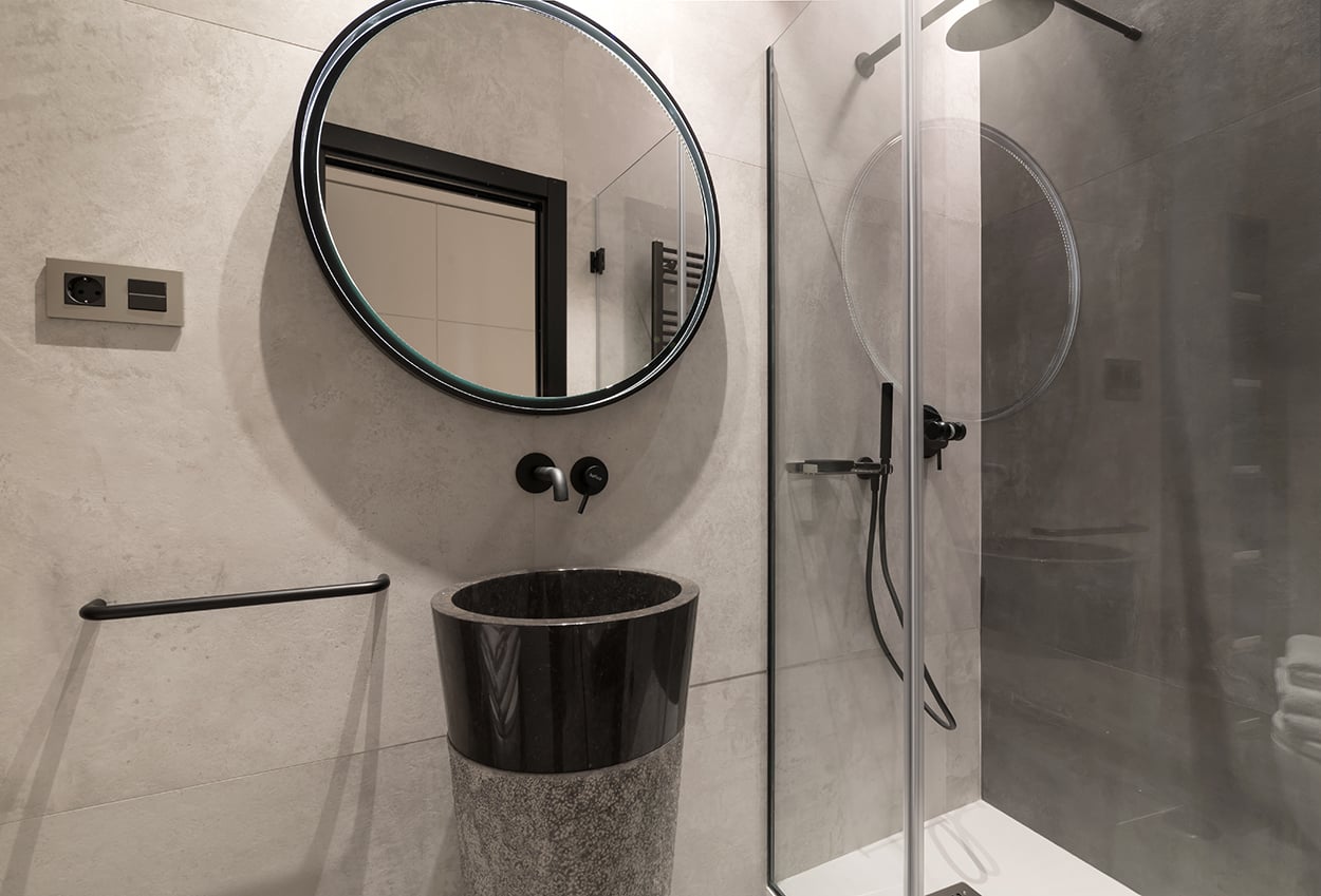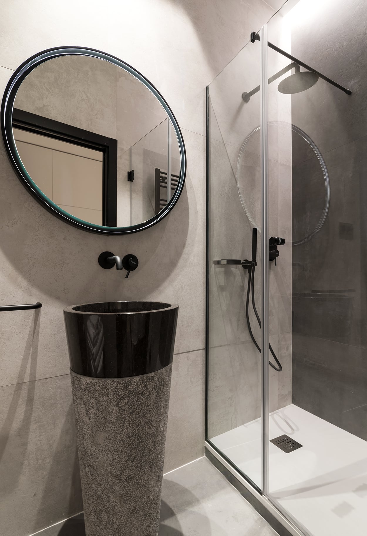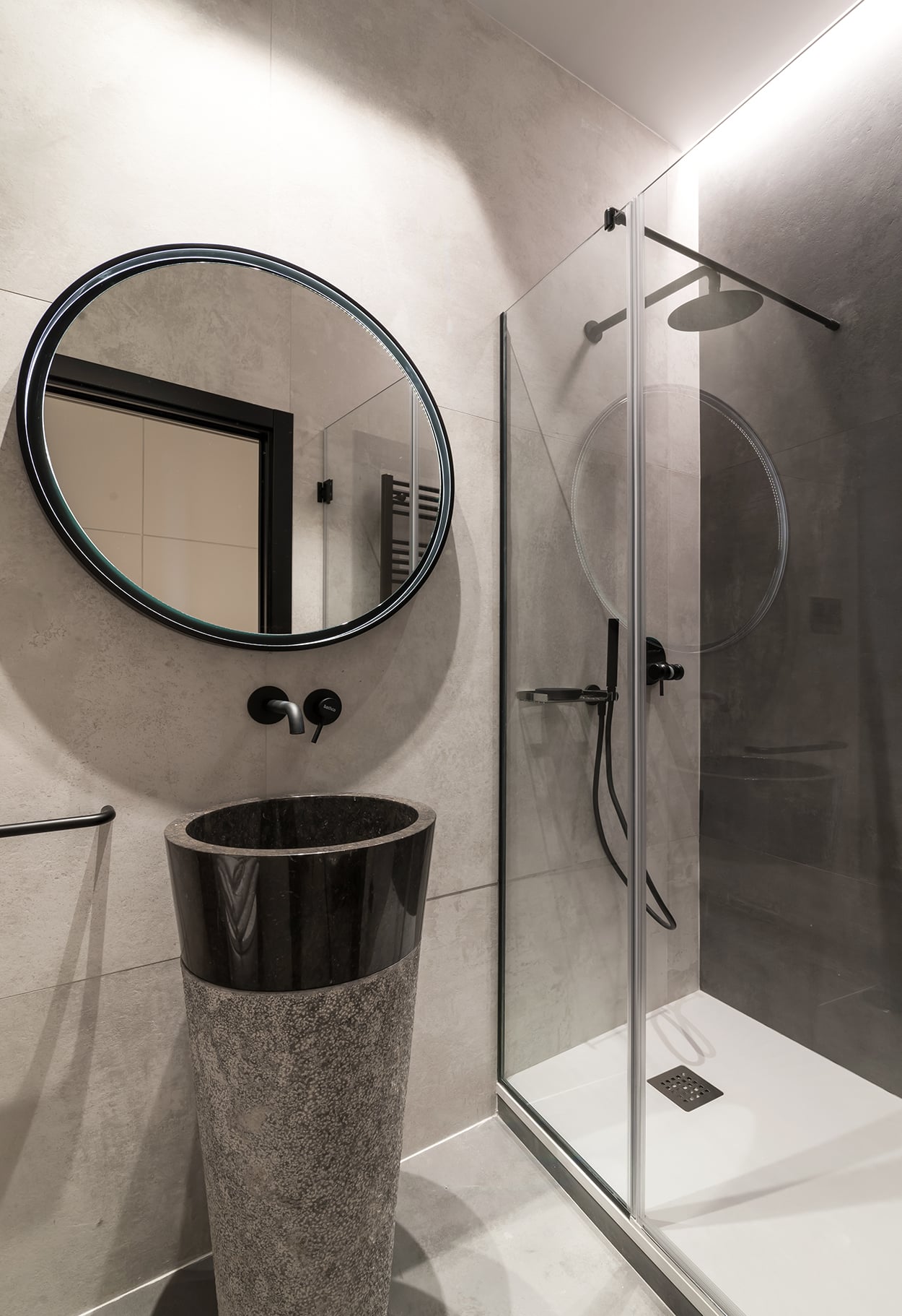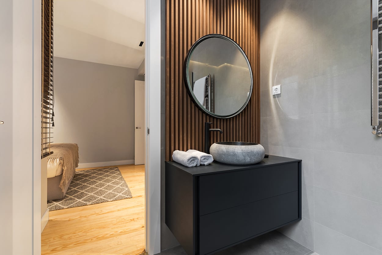Encima de la palillería, colocamos un espejo en forma circular, dando ese toque de diseño moderno, junto con un mueble lacado en color negro y un lavabo de piedra.