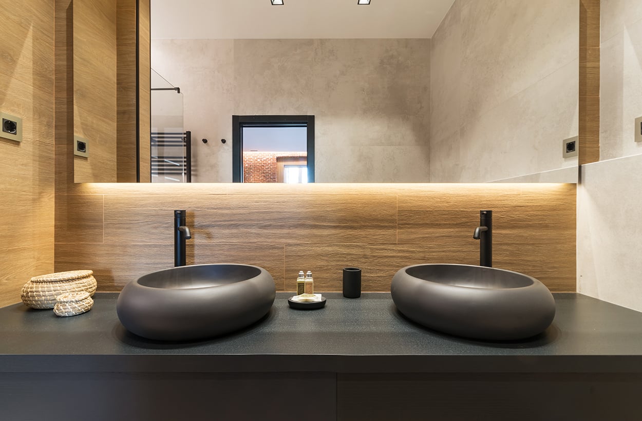 Colocamos un gran mueble de Codis con una encimera de madera laminada, dos lavabos en piedra con grifería negra de Bathco, el resultado: un espacio moderno perfecto.