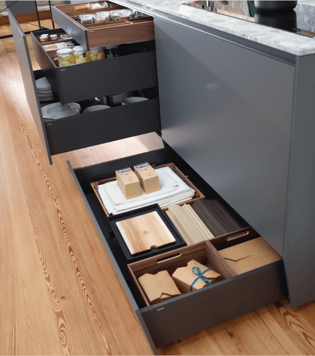 Otros accesorios como, por ejemplo, los cajones divisores y contenedores extraíbles, la panera, el soporte botellero, el porta-baguette o el porta-tablas, resultan muy útiles para segmentar el interior de las gavetas, organizando los contenidos sin restar capacidad.