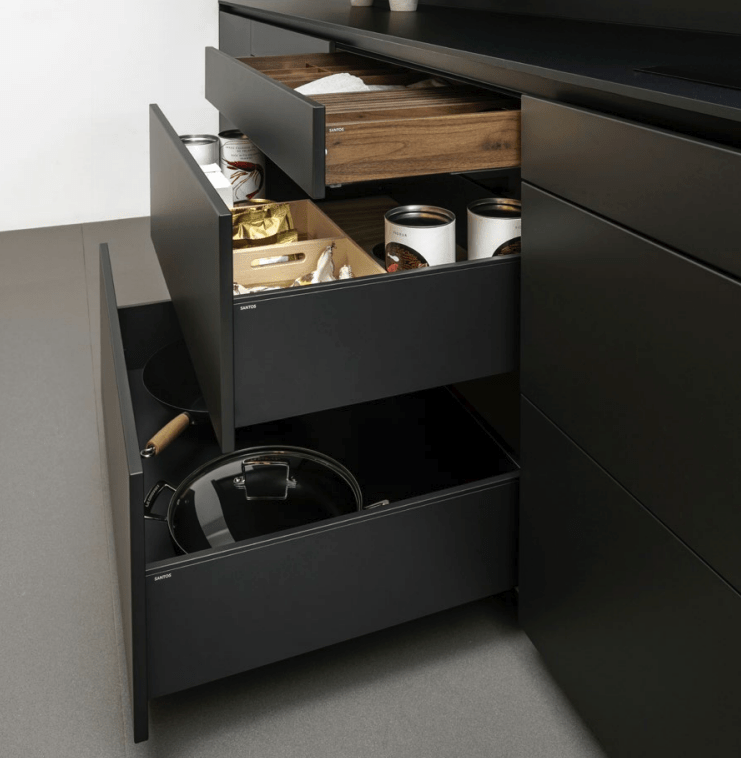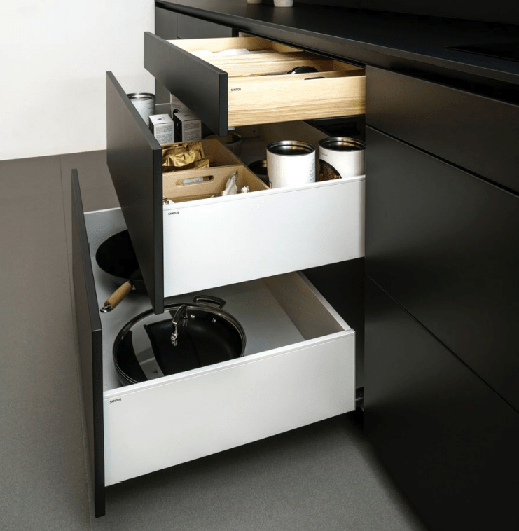 Santos evita los módulos con puertas en la zona baja, por sus limitaciones de accesibilidad y alcance visual, promoviendo en su lugar el uso de cajones y gavetas de extracción total, capaces de soportar hasta 70 kg de carga, gracias a su apertura total y gran capacidad, estos ofrecen una visión panorámica que facilita el acceso y la localización de contenidos.