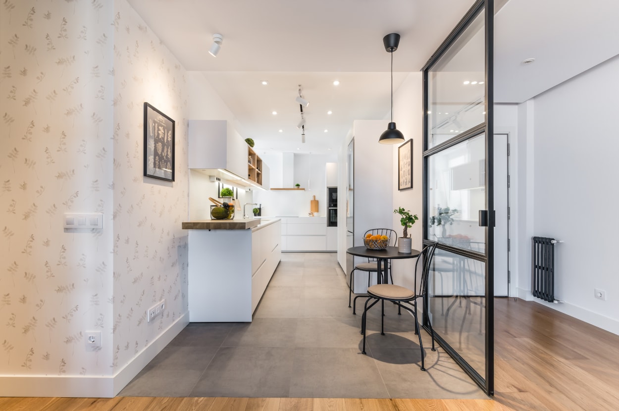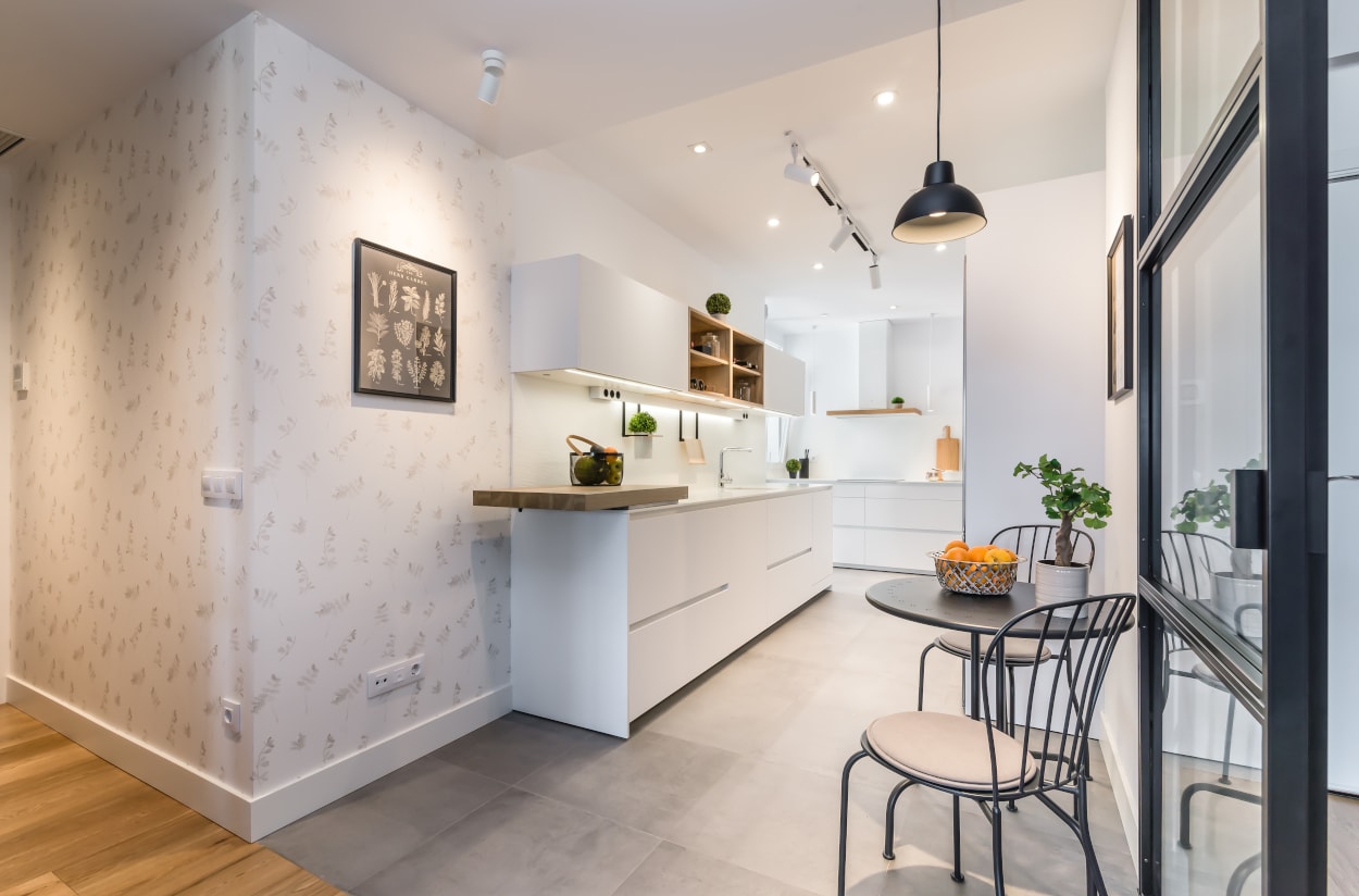Esta cocina blanca con una distribución en paralelo y abierta al salón, desprende estilo y luminosidad. además, es cómoda y funcional y cuenta con mucho espacio para el almacenamiento y la organización.