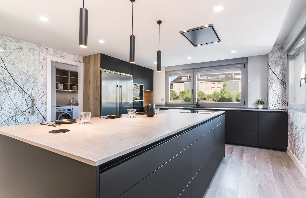 Cocinas Santos modelo plataforma E, con material estratificado, color negro seda. Encimera de Dekton, color Soke. Electrodomésticos Neff y Pando. Fregadero de Veravent. Iluminación de Stiluz.