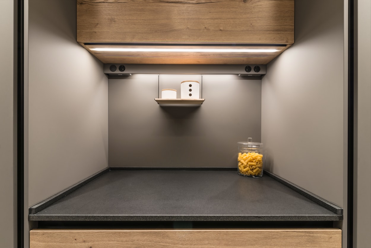 Cocinas Santos modelo plataforma D en color Gris visón seda y roble rústico sincro con material estratificado y laminado. Encimera de Naturamia en color Sahara nights.