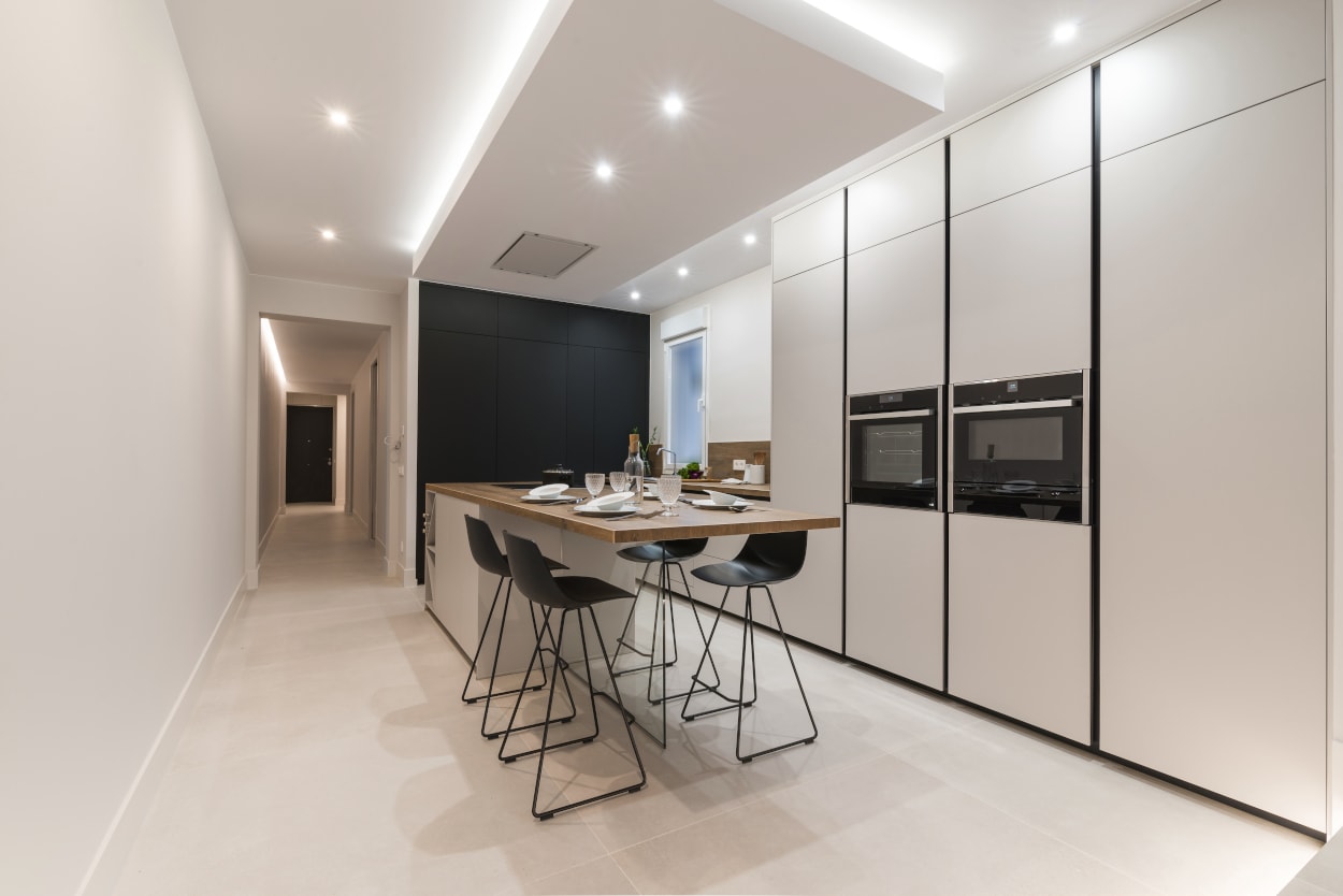 Si optas por una cocina blanca, destaca el espacio con una encimera espacial o unos muebles altos en madera, así conseguirás dar un toque especial y distinguido a la cocina.