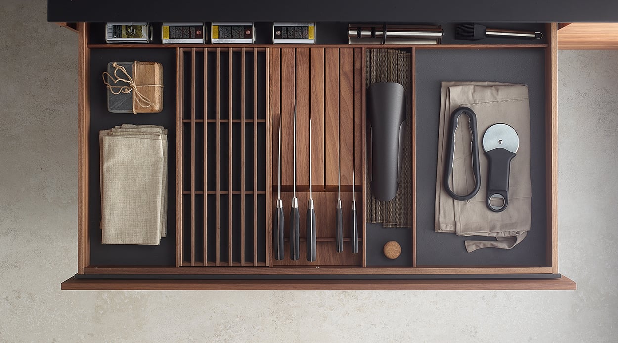 Tan importante es el diseño de los muebles exteriores como el de los interiores. Planifica los módulos y accesorios que necesitas para la organización de todos los accesorios de la cocina.