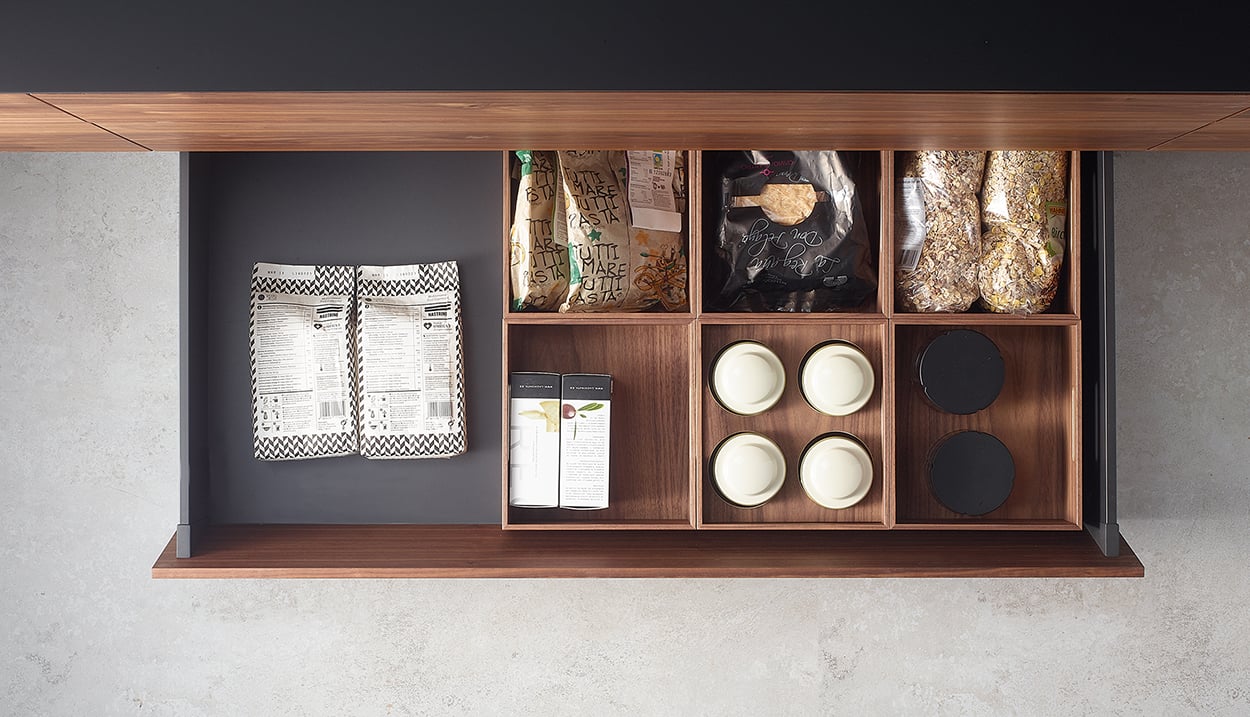 En los muebles de cocinas Santos hay infinidad de opciones como: cajones extraibles, gavetas para guardar vajilla y sartenes, gaveta para guardar la despensa… La clave es elegir una solución que te ayude en el día a día…