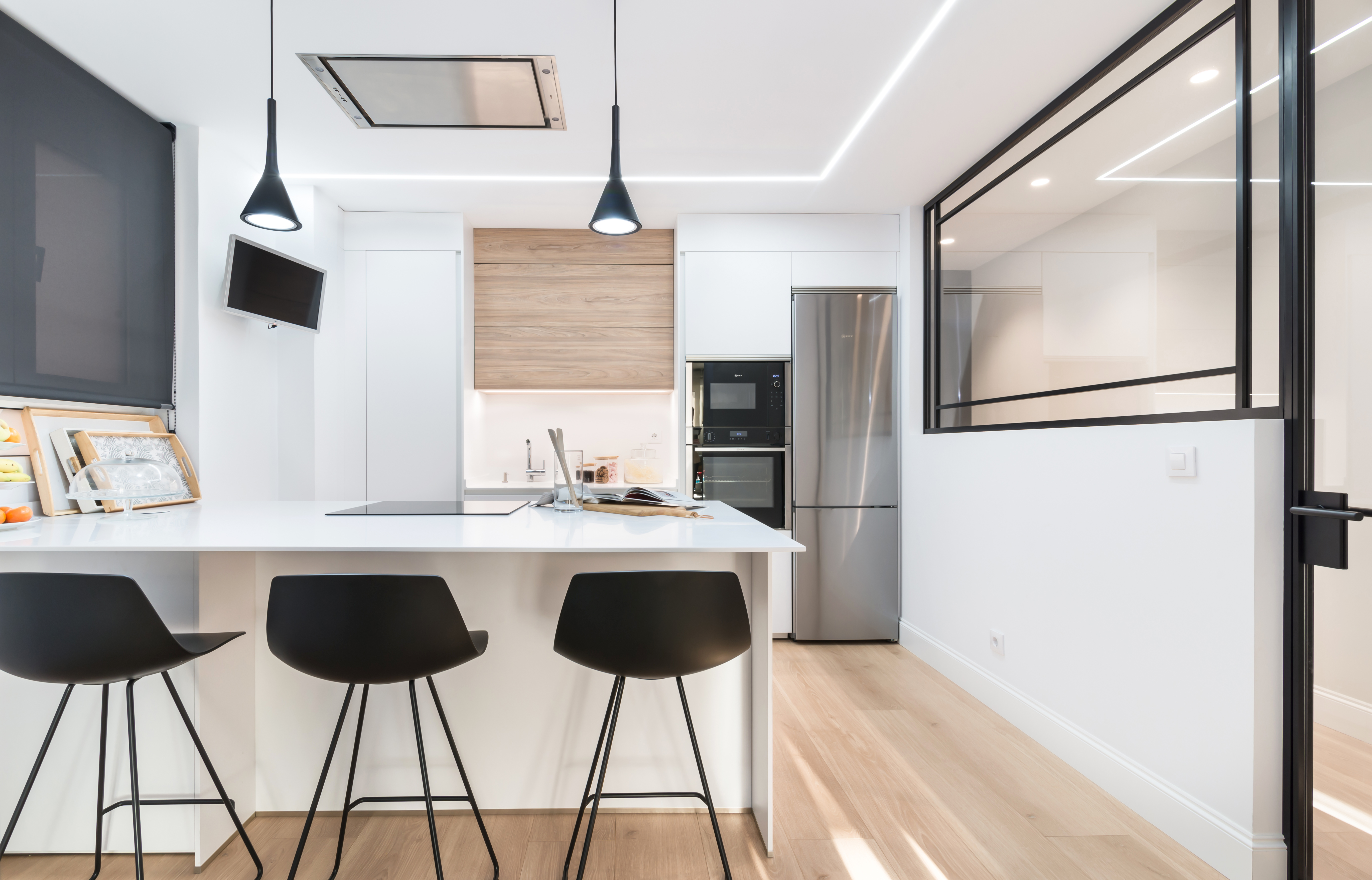 ¿Un espacio pequeño? Si haces una buena planificación y distribución del diseño, sácale partido y opta por colocar una barra para comidas rápidas.