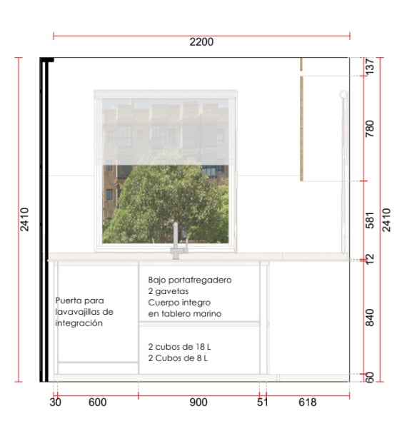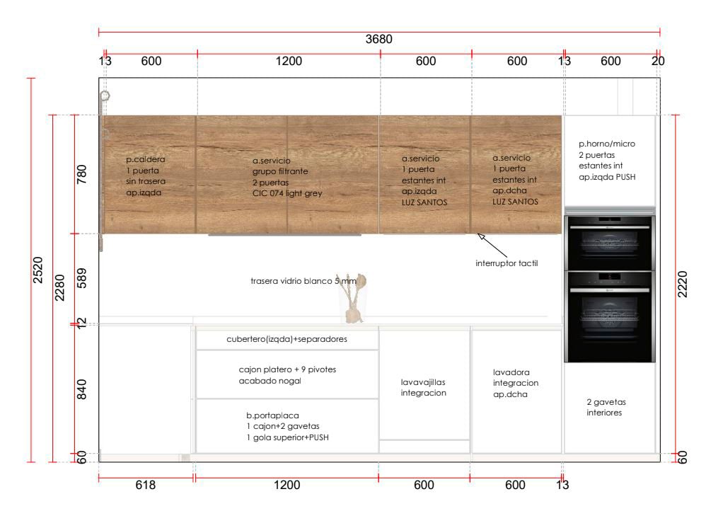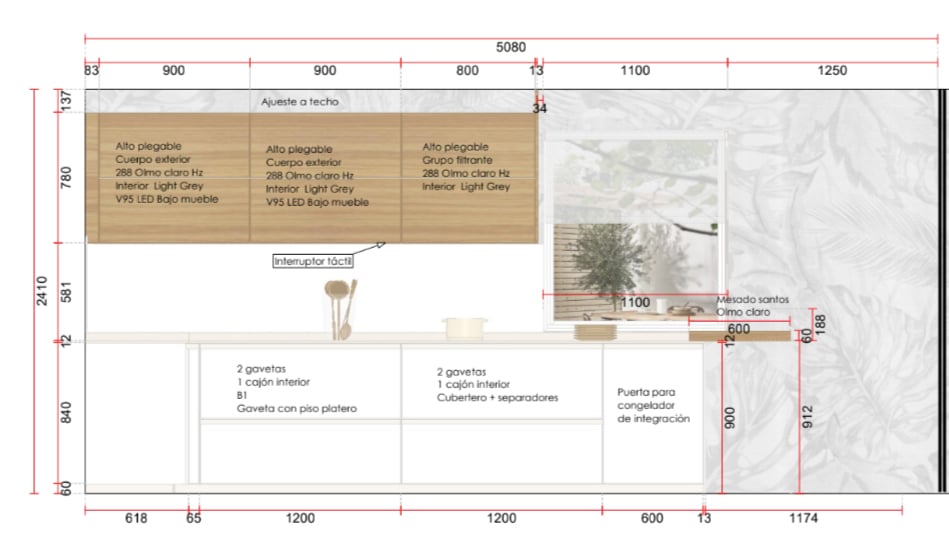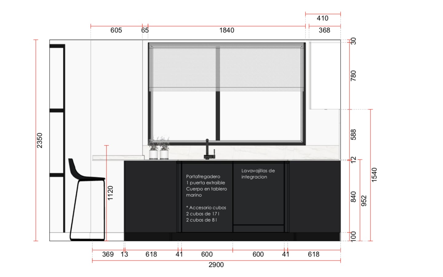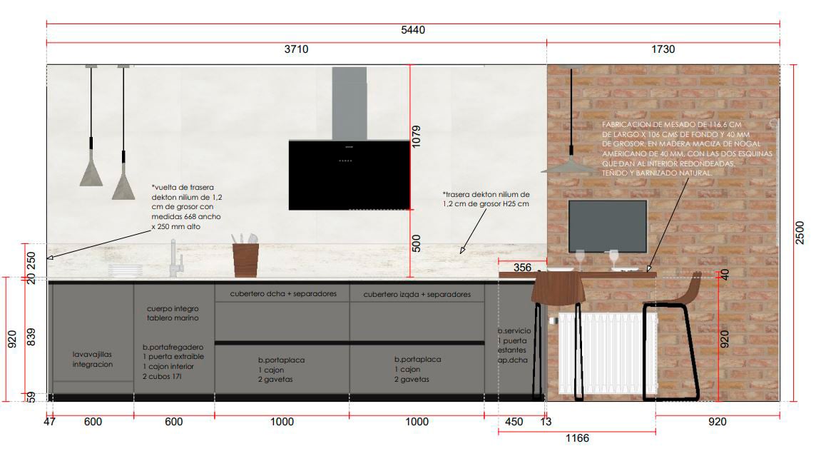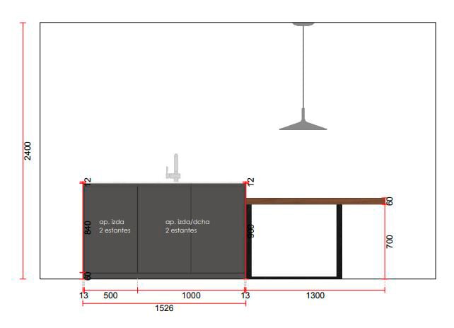 En este caso, agregamos una prolongación en unos de los frentes, creando una cómoda barra para desayunos y comidas rápidas.