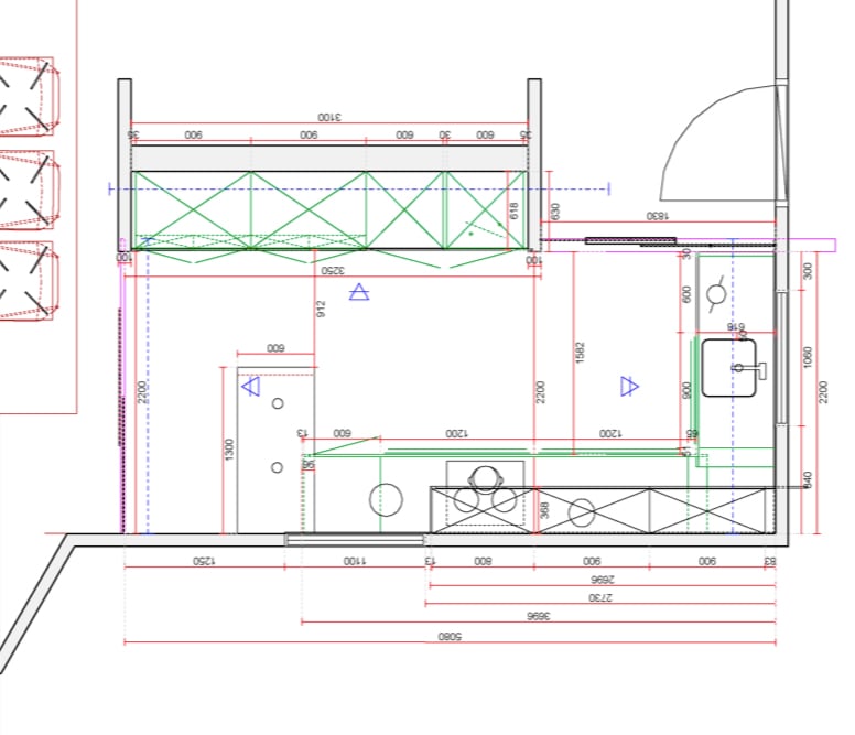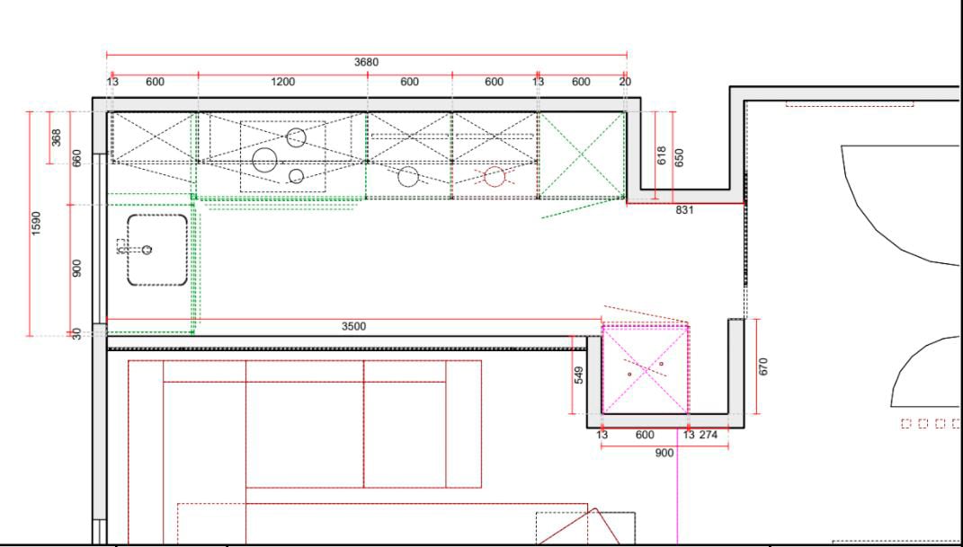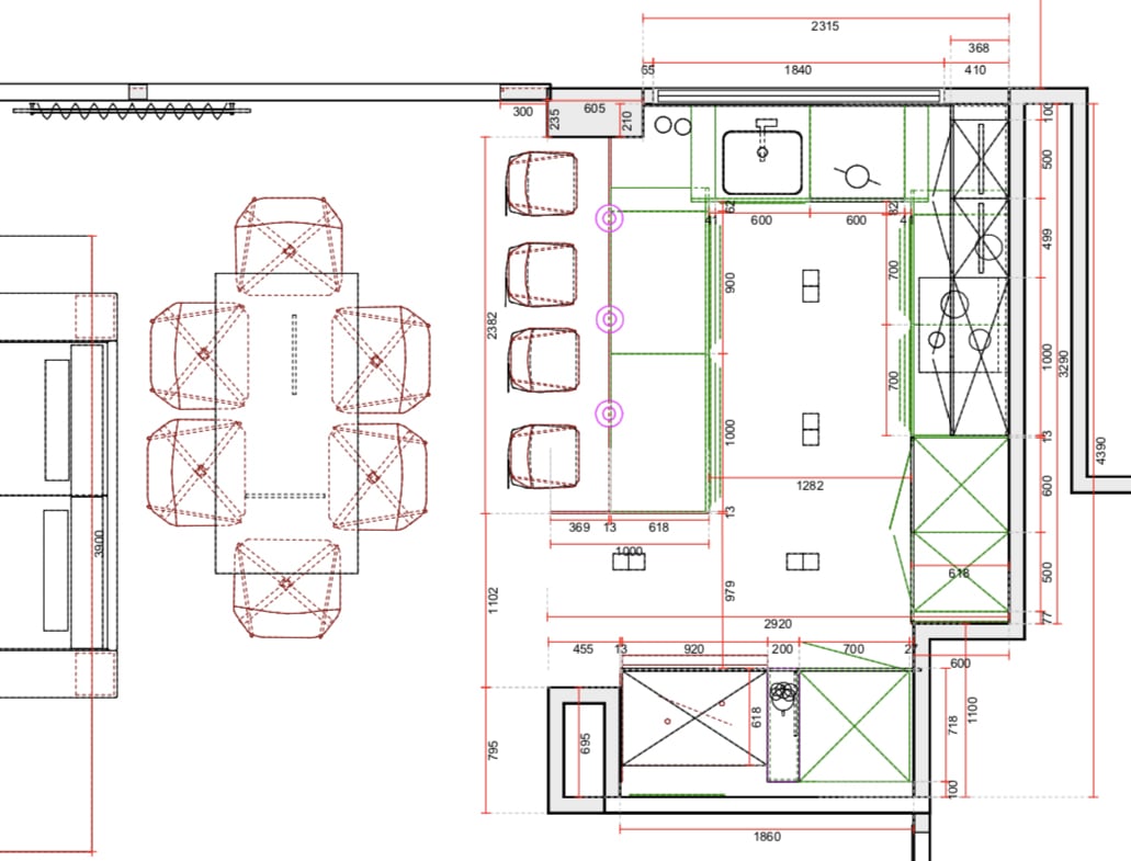 Durante el estudio de la distribución, debemos tener muy en cuenta la ubicación de los electrodomésticos, zona de aguas, zona de cocción, espacio para trabajar y capacidad de almacenamiento.
