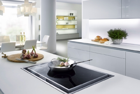 Gracias a un estudido diseño y sistema de extracción, Mesa permite eliminar el humo desde tres ángulos. El cuerpo y el filtro de la campana quedan ocultos en la zona de cocción, pudiéndose limpiar con sólo levantar la tapa.