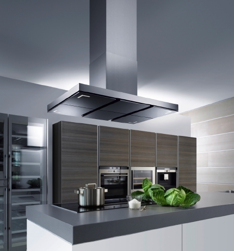 La campana de techo Capa integra una función de recirculación que impide que los gases se escapen lateralmente, proporcionando al espacio un gran confort. Mención especial merece también su atractivo diseño, que surge de la combinación de acero inoxidable y elementos de vidrio.