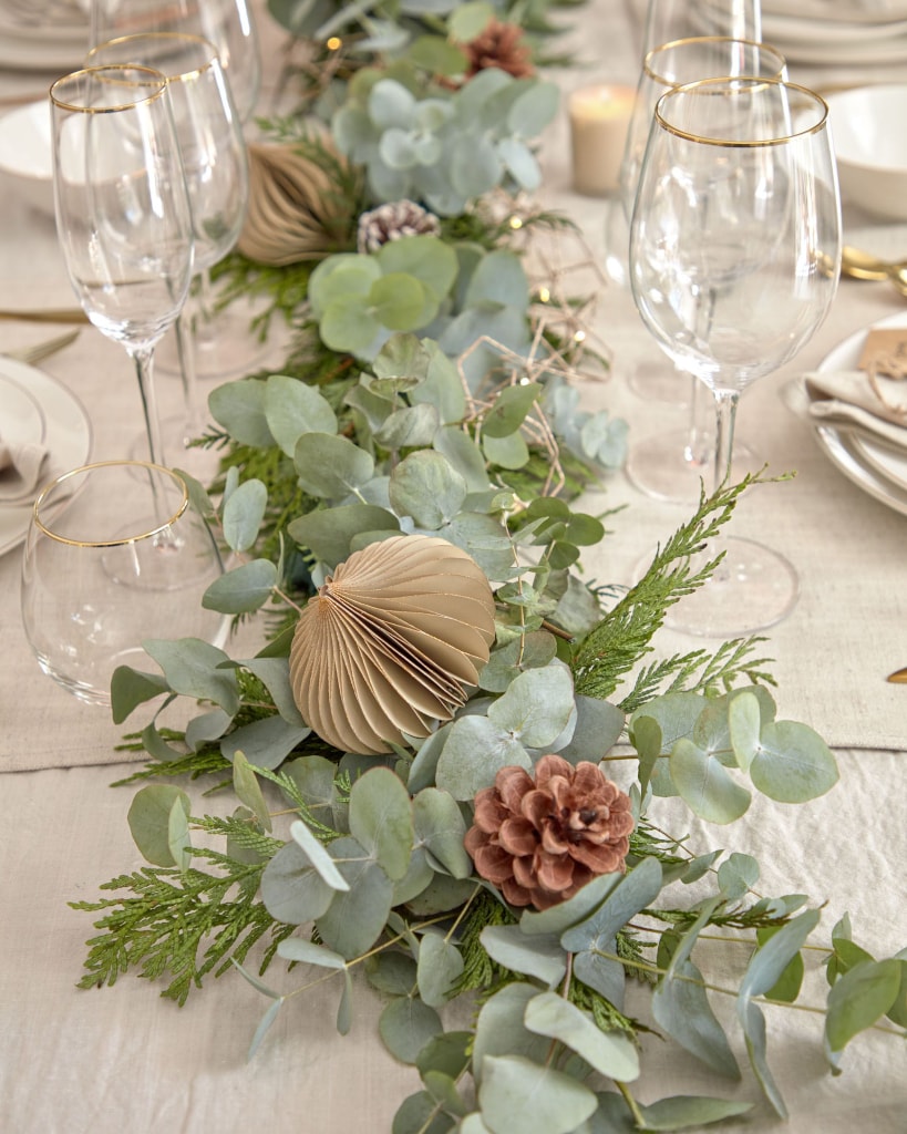 Opta por algo sencillo pero llamativo. El eucalipto es muy buena opción, además, al secarse queda incluso más bonito. Mezclado con piñas y algo dorado, será el centro de atención de la mesa de navidad.