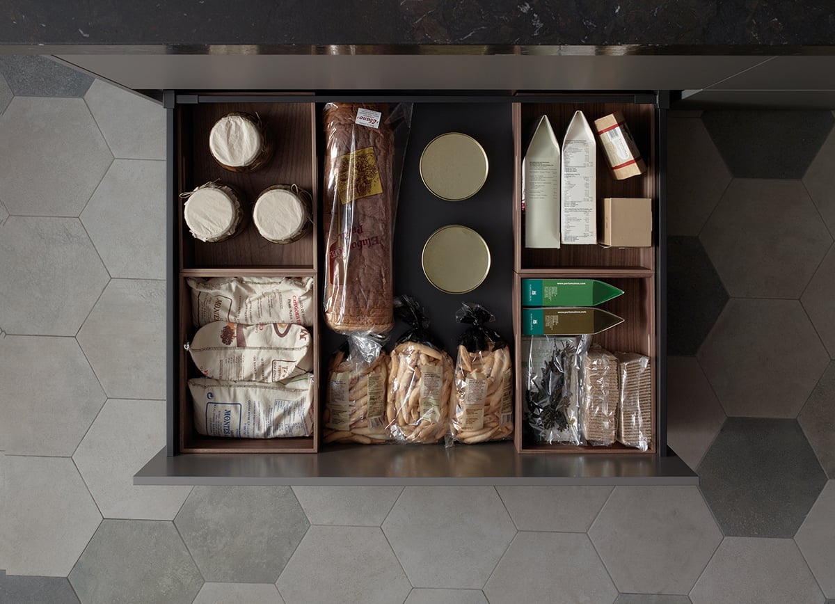 Establece jerarquías por utilidad y tipo de alimento. Para ello, puedes utilizar los contenedores de Santos y sacar el máximo partido a las gavetas de tu cocina.