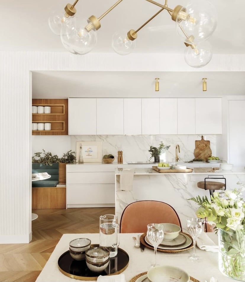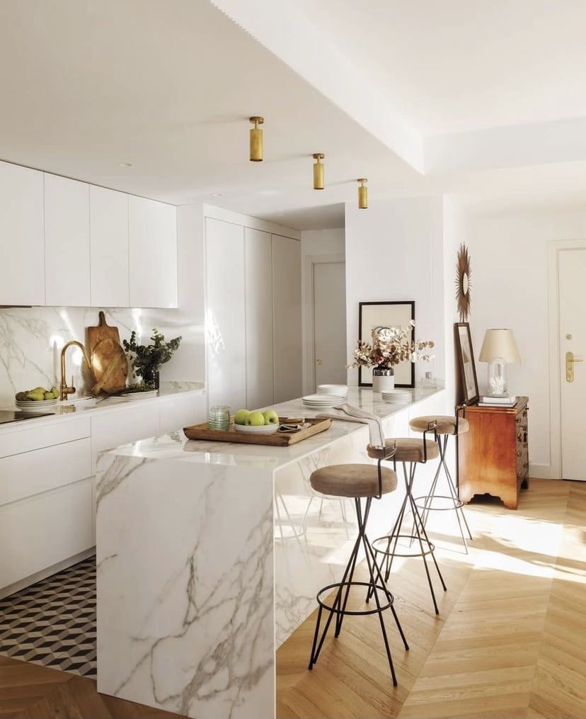 Además de colocar el mármol en encimeras, es frecuente ver islas de cocina, traseras y revestimiento de paredes con mármol.