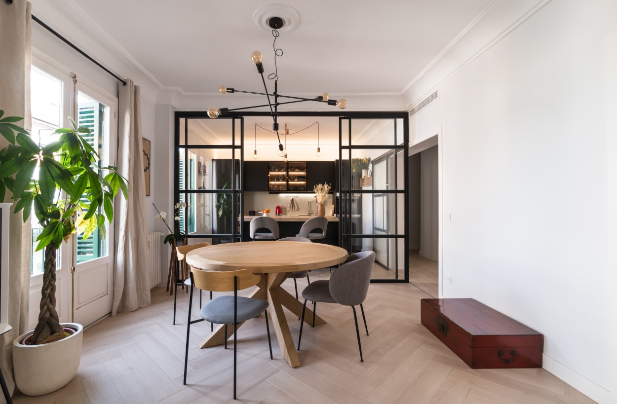 Este diseño de puerta corredera hecha en madera maciza de haya y cristal se integra a la perfección con la cocina y con el diseño del recibidor y salón.