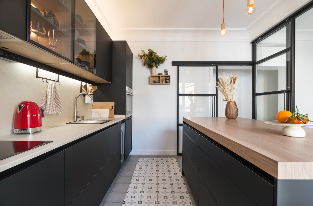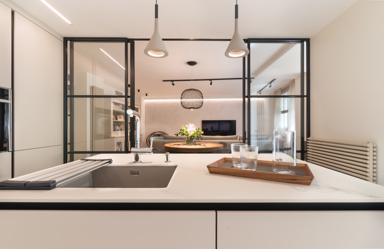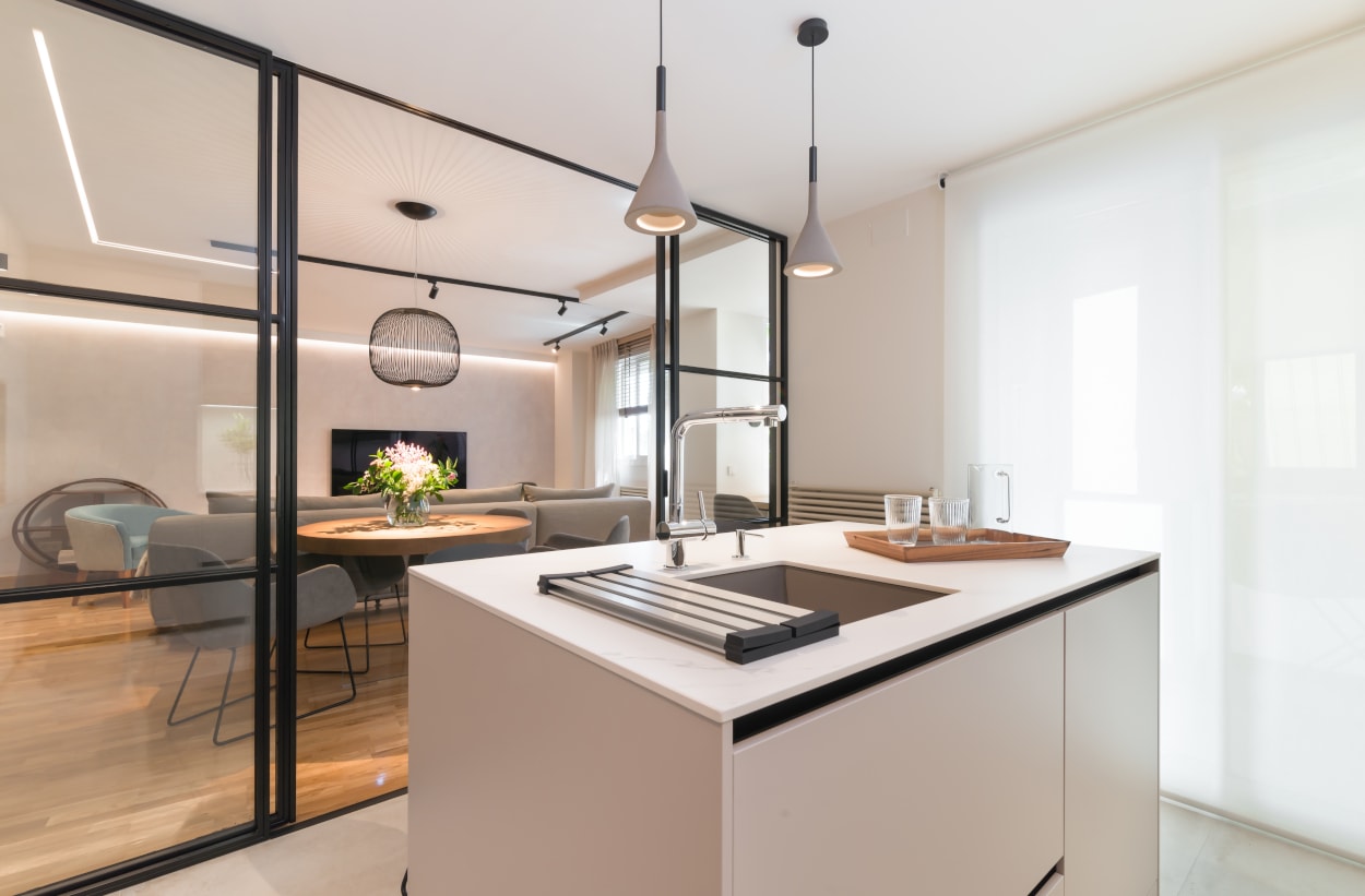 El diseño de esta puerta y ventana moderna comunica la cocina con el recibidor, salón y comedor, creando un espacio mucho más amplio y luminoso.