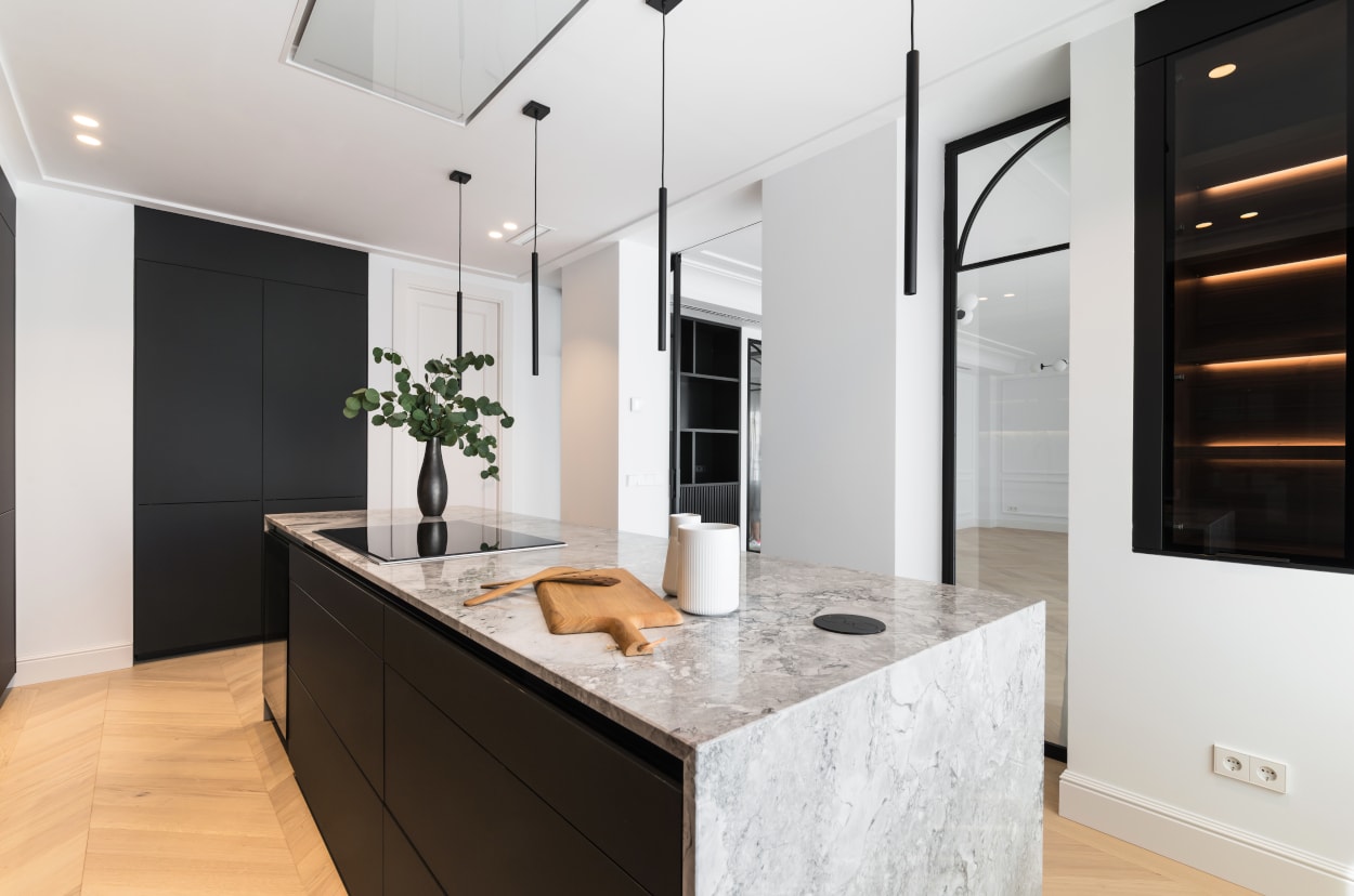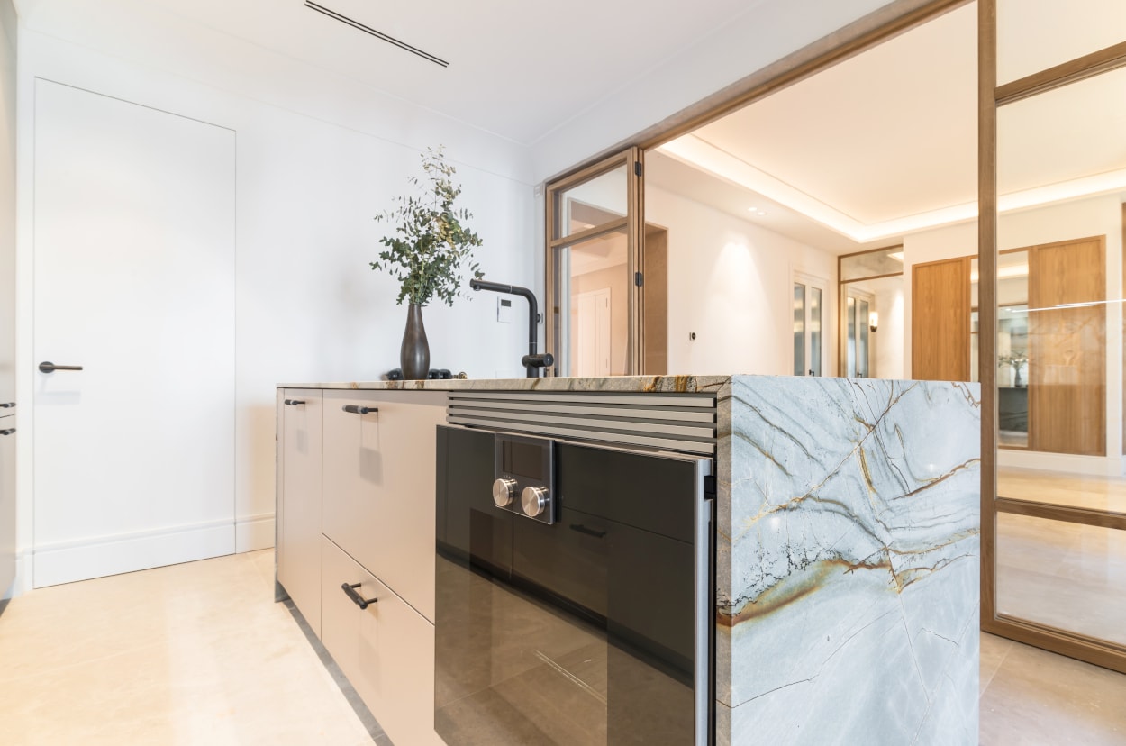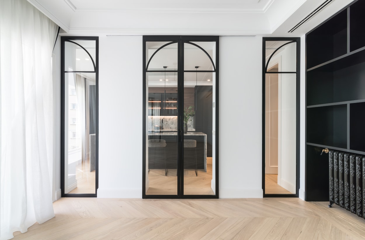 En este caso, el diseño de puerta comunica la cocina con el salón, siendo parte del diseño global de la estancia, aportando elegancia y sofisticación.