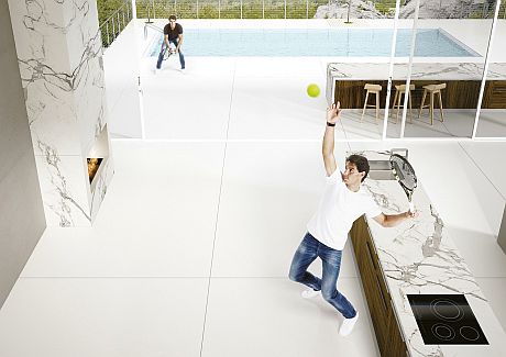 Its excellent properties, such as high mechanical resistance; good thermal shock resistance; very good colour stability; high resistance to scratching, staining, abrasion, UV rays and hydrolysis; and reduced wáter absorption means that Dekton can be used on kitchen worktops and bathroom vanities, wall and floor treatments, furniture, façades and any other exterior surface. The new advertising campaign entirely reflects this versatility for applications that Dekton offers, placing the tennis star in two large sets, one indoors and the other outdoors, which are completely covered with the new ultracompact surface in the shades of Aura (white with grey veining on worktops and walls), Zenith (matt white on interior and exterior floors) and Strato (grey on wall).