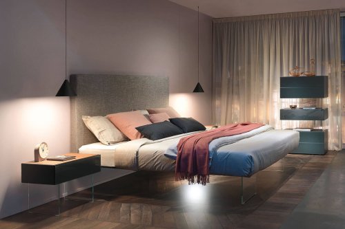 La cama sobre unas patas de cristal le da ese punto tan especial con el que conseguirás triunfar con el diseño moderno de tu dormitorio.