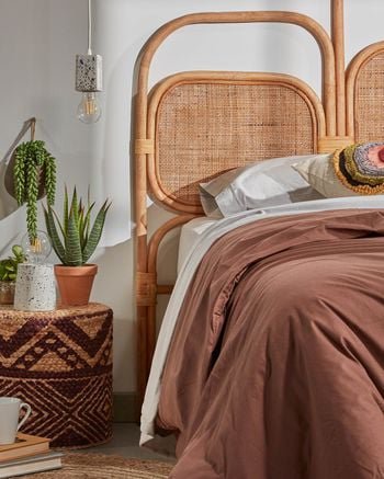 Nos encanta el diseño de este dormitorio, cuidado al detalle, con diferentes texturas y colores, como el cabecero de rattán, las plantas en cestos de mimbre y una combinación de textiles muy acertada.